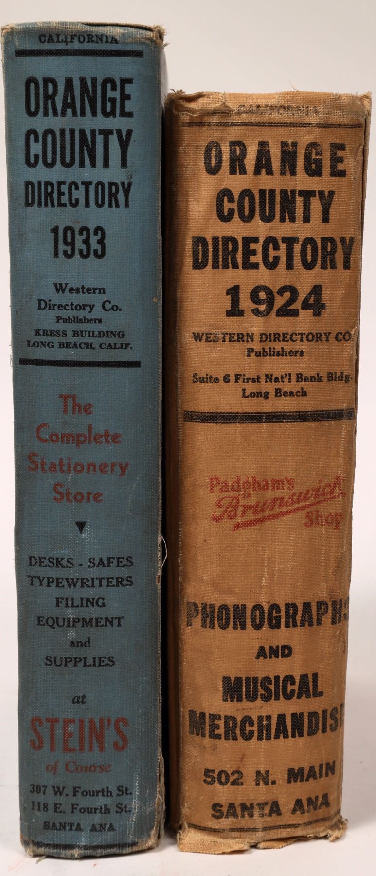 Orange County Directories, two editions, 1924 and 1933. Printed and published by Western Directory Co. Publishers. Contains information about businesses, citizens, and locations in Orange County.