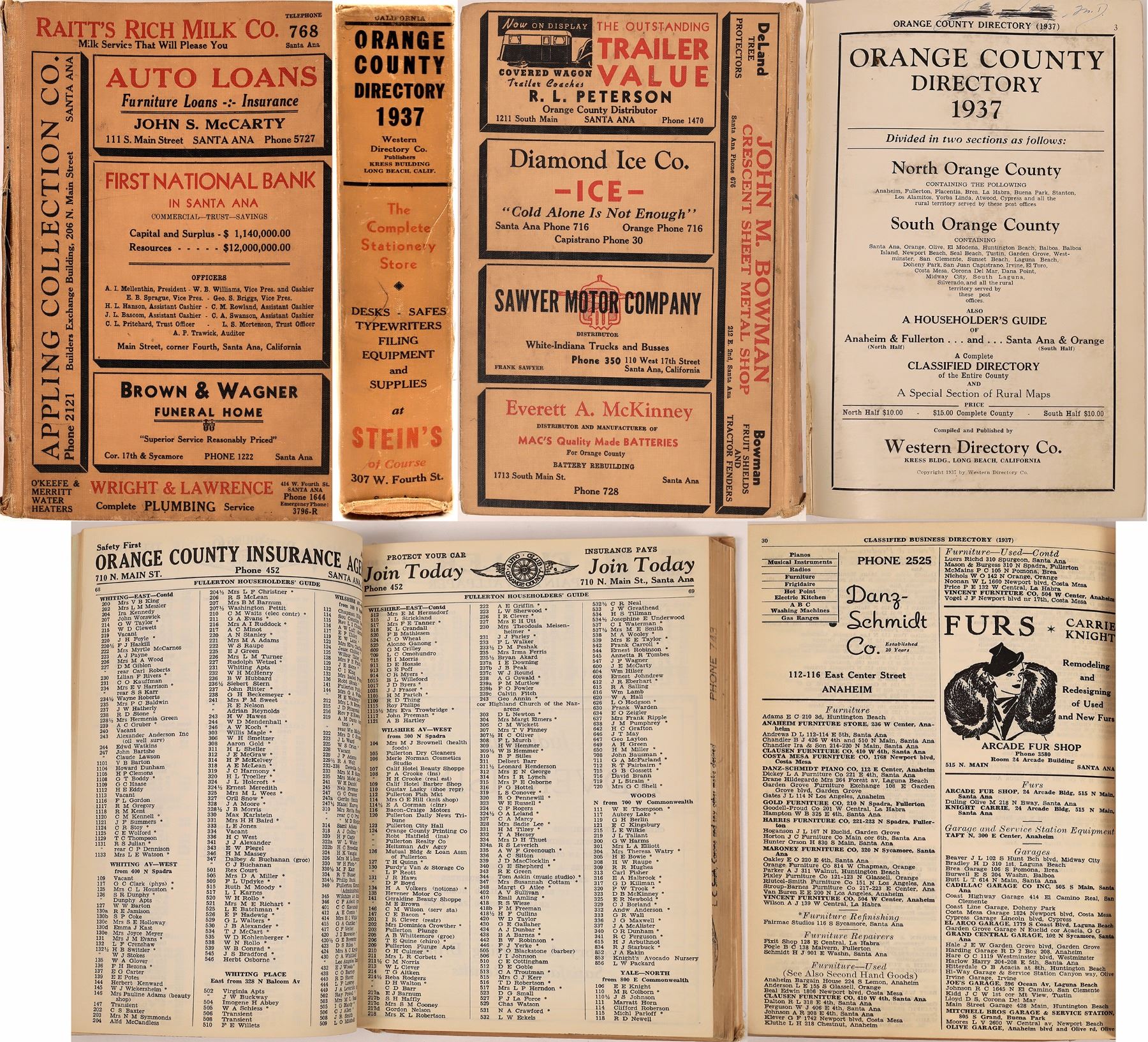 Published by Western Directory. Divided into two sections: North Orange County and South Orange County. Roughly 800 pages. Index and list of abbreviations. Householders Guide. Classified Business Directory. Maps of city streets. Spine is half disconnected to front cover. Front cover is loose, but pages are strongly connected.