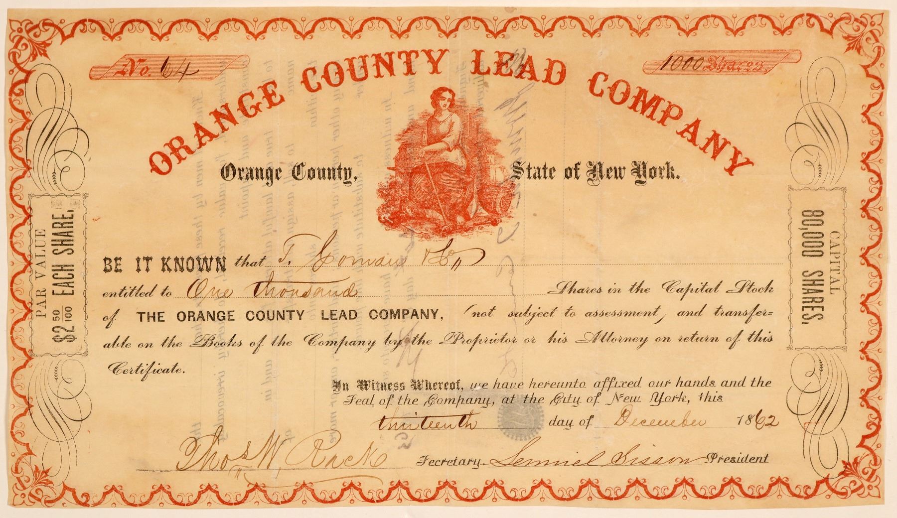 Rare. No. 64, issued for 1,000 shares to T. Cowan & Co. on Dec. 13th, 1862 in New York. Signed by president Samuel Sisson and secretary Thomas W. Racks. Not cancelled. Black and red print on thin paper, red border, allegorical red vignette. 5.5 x 9.75" Folds, toning. Probably formed to exploit the lead deposits in Orange, Sullivan, and Ulster counties. No other information found. Houghton Estate Collection