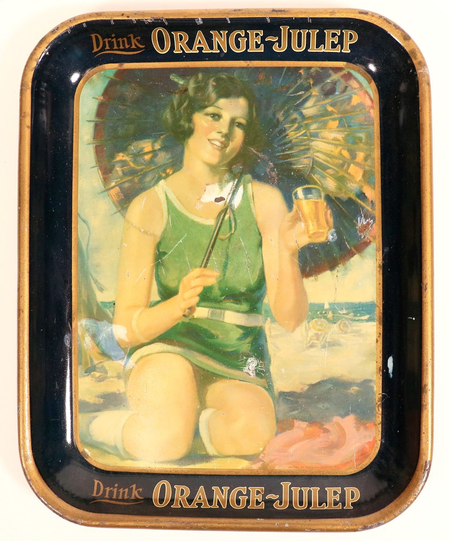 This serving tray is to "Drink Orange-Julep" invented in Montreal, Quebec. Our tray measures 10.25 in. X 13.25 in. Marked on both ends, depicting a young lady with an umbrella at the beach. A royal blue border. C.1930's. Some paint loss, good condition. c.1930s