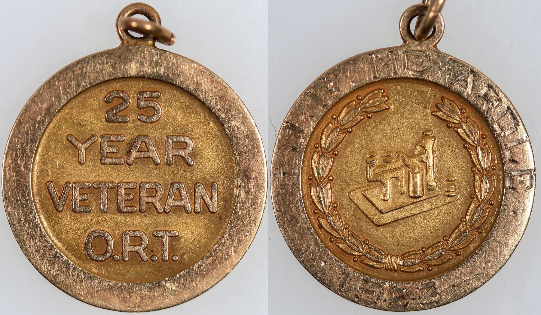 Awarded to J. B. McArdle in 1923 for 25 years of service. Tests, 14 carat gold, 20 mm, 3.1 grams.