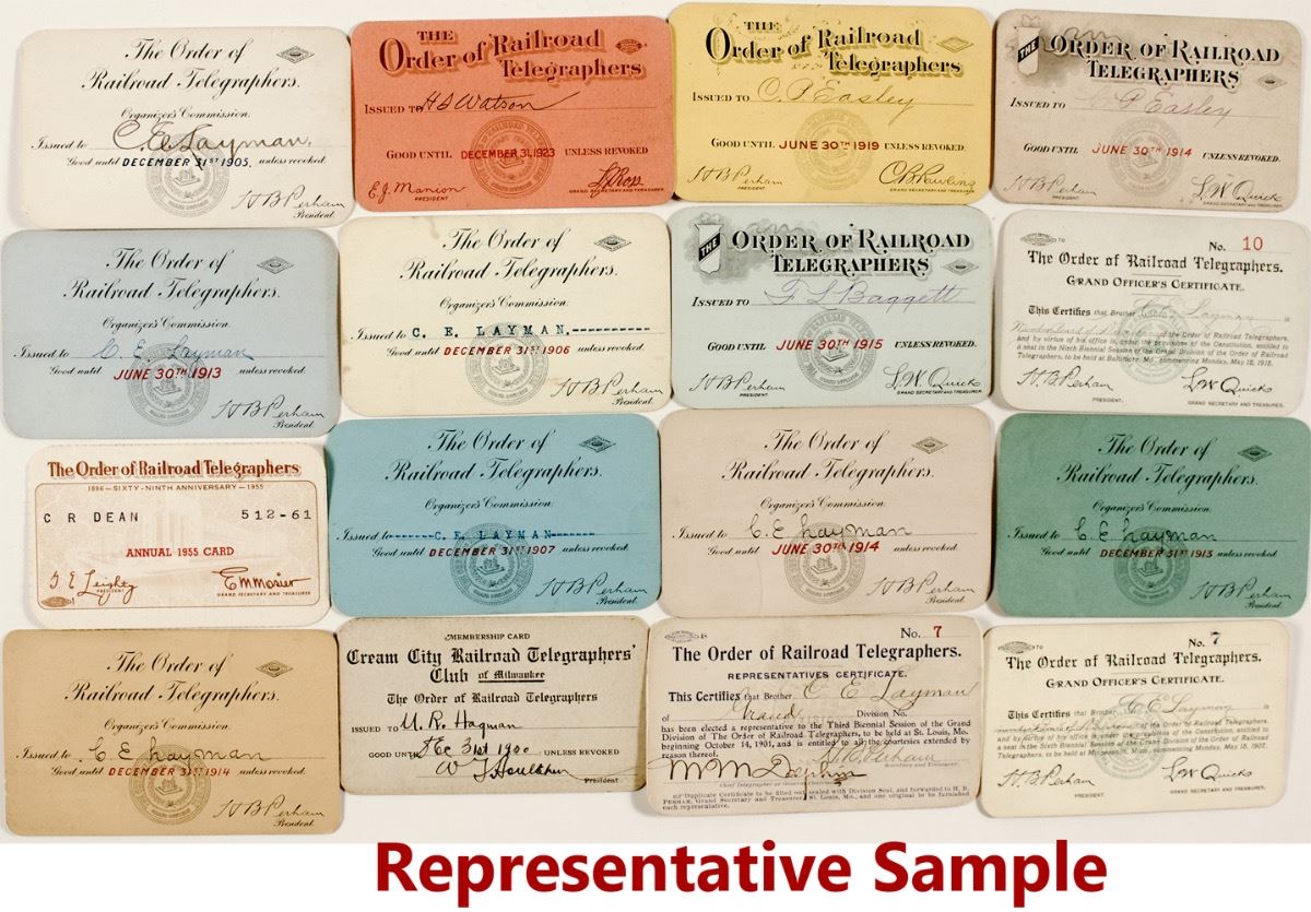 103 pieces!!! Eighty-nine membership cards: span 1905-1966, with duplicates and missing years. Two Representatives Certificates (1900 and 1901). Nine Organizer's Commission cards (1905, 1906, 1907, 1911, 1912, 1913 (2), 1914 (2)). Two Grand Officer's Certificates (1907 and 1913). Finally, a membership card for Cream City Railroad Telegraphers' Club of Milwaukee (1900). Prag Collection City: State: United States Date: hwac# 22613