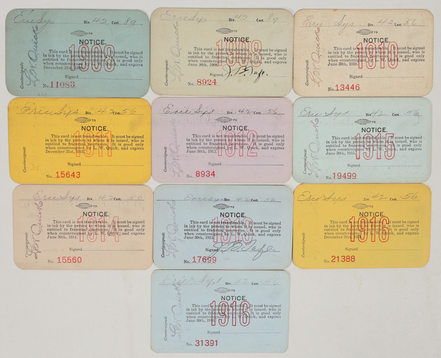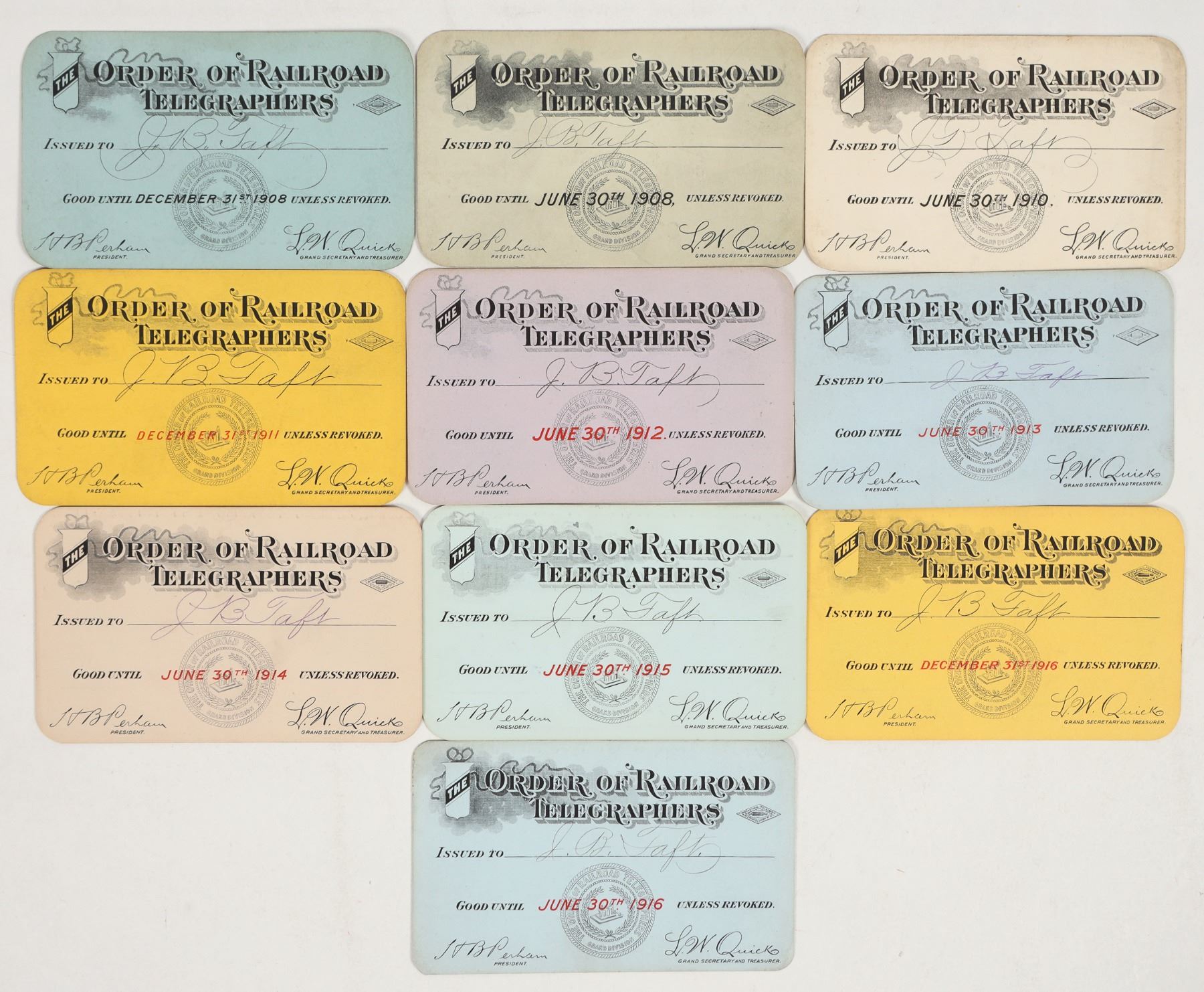 Lot of 10. Order of Railroad Telegraphers Passes, 1908-16. Issued to J.B. Taft. All in VG-excellent cond. Each has the logo in underprint of the 'The Order". Signe n eh back by L.W. Quicke, Grand Secretary and Treasurer of the Order of Railroad Telegraphers.