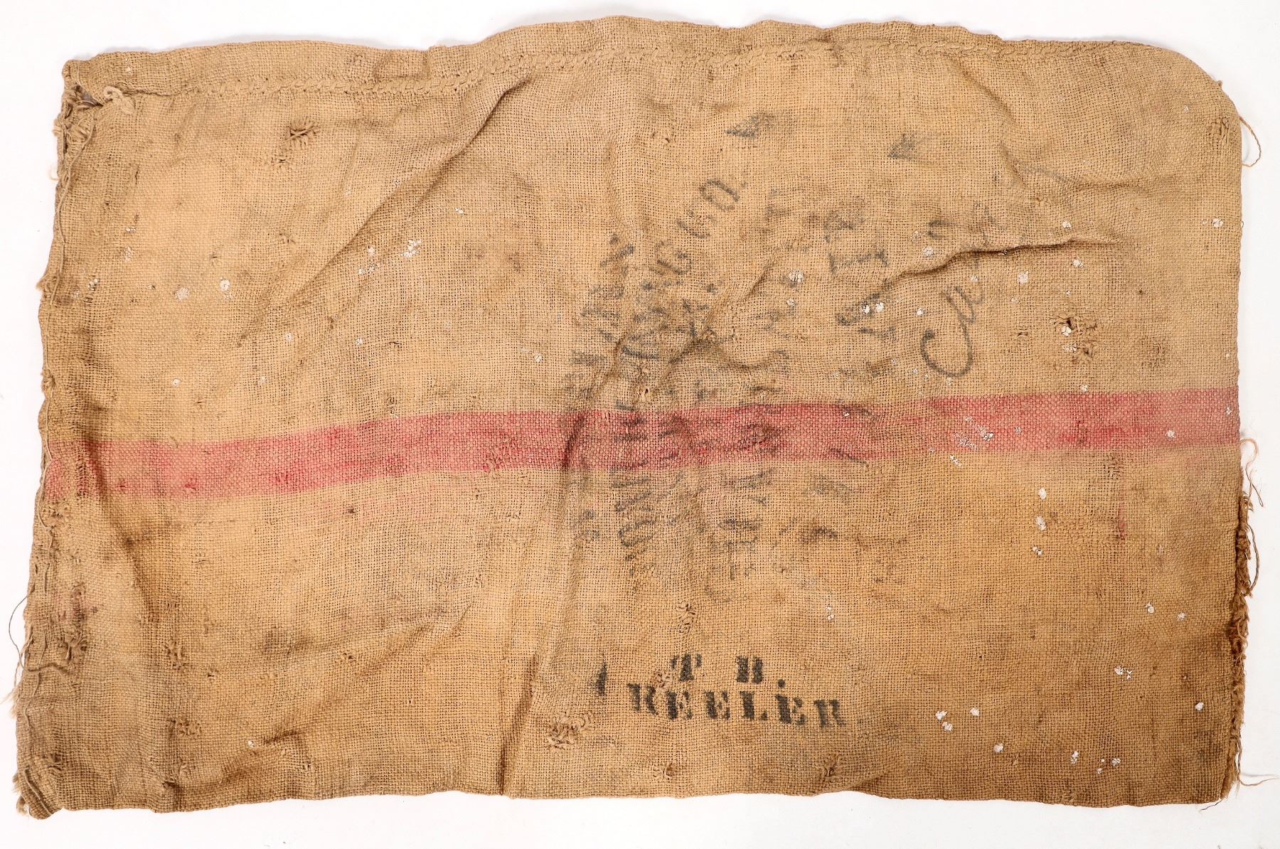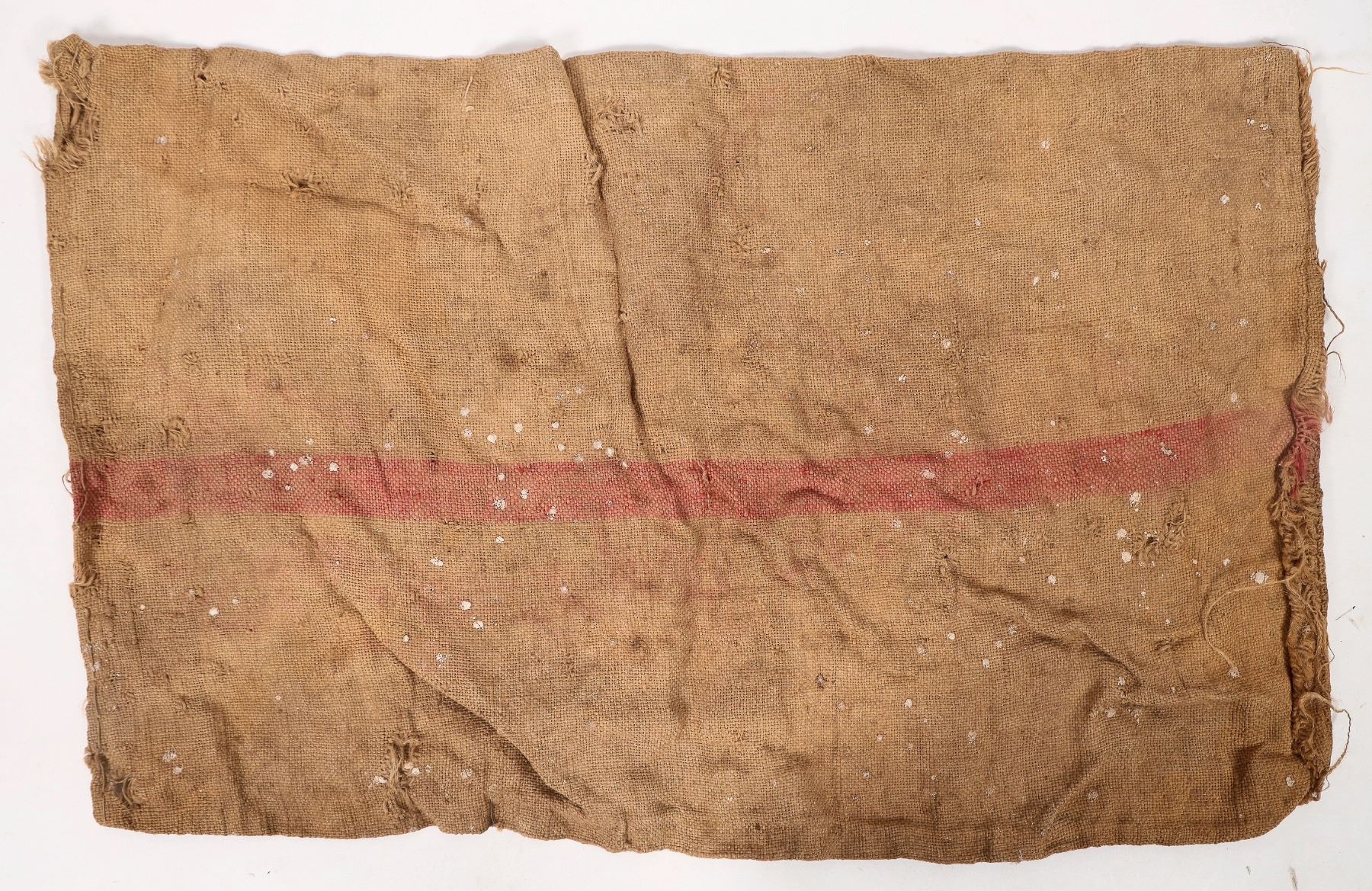 Large canvas ore bag with a slightly finer weave than the older c1875-1880s ore bags from the New Coso mining Co. in this sale (lucky Jim and Christmas Gift mines.) approximate date, c 1885-1910. 21" x 32", also a bit larger than the older ore bags. This bag is marked "T.B. Keeler" in black block print. The marking is newer, possible during the Darwin Development Co. period, circa 1915. Underprint for the specific mine is present, but is difficult to read. The bag has a 1 1/2" wide red stripe vertically up the middle of the bag. Perhaps different lighting techniques can allow for reading the mining company name. Palazzo Collection.