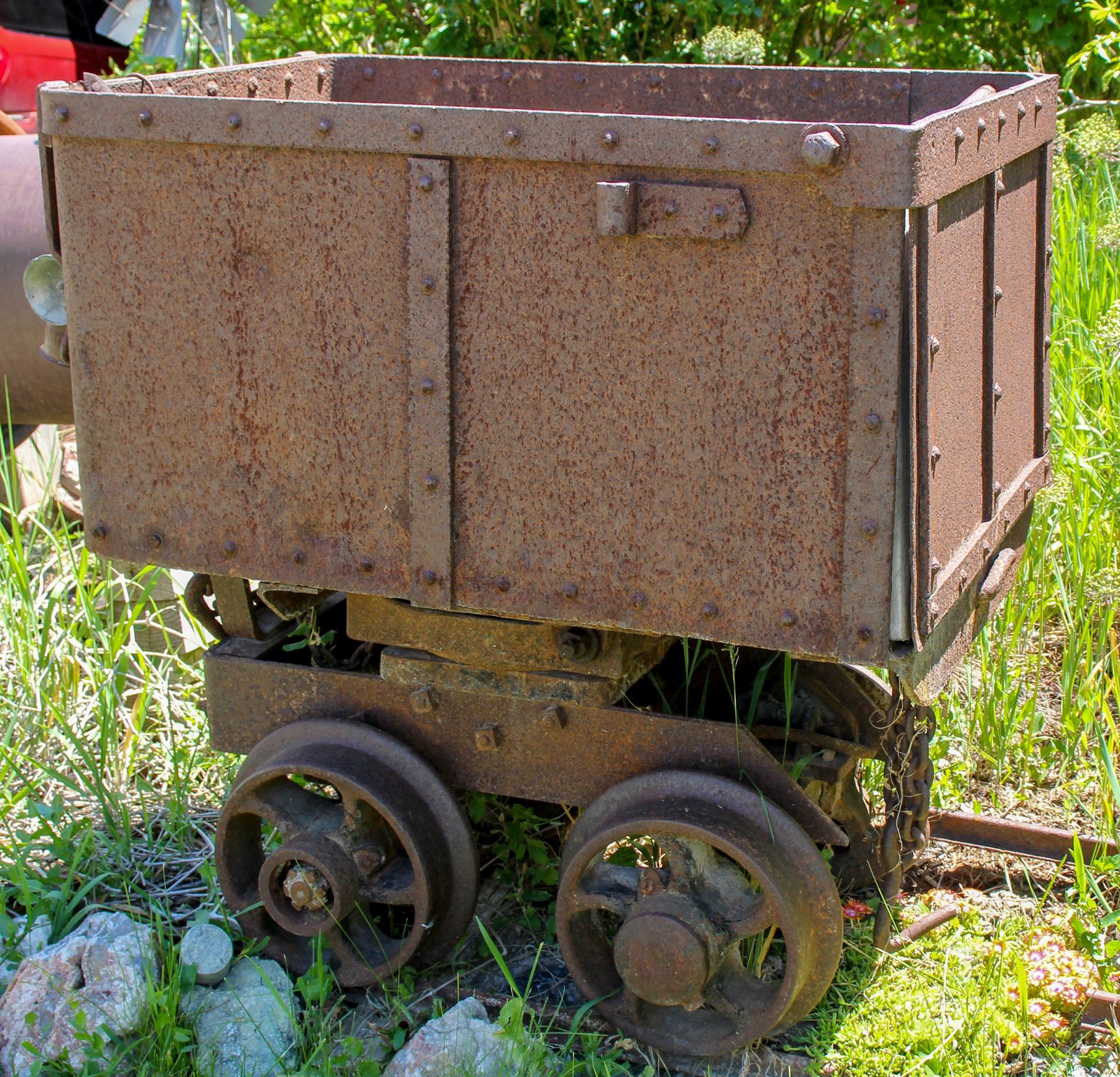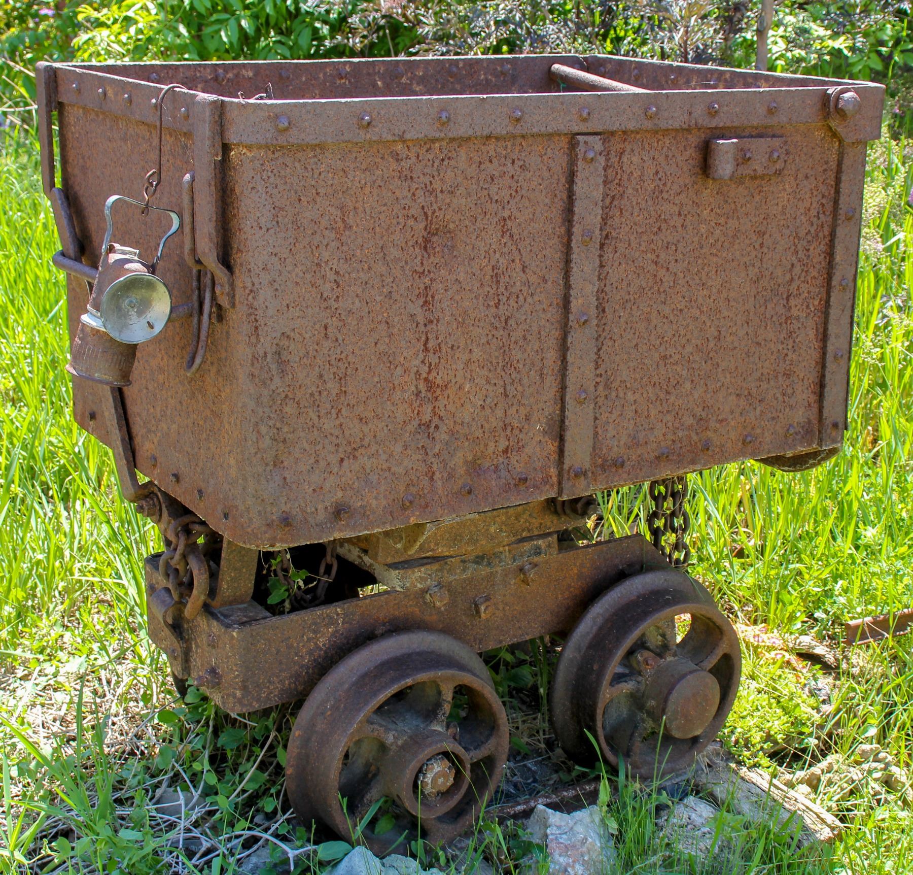 Nice iron end dump ore car, appears complete. Curved spoke. FOB Salt Lake City.