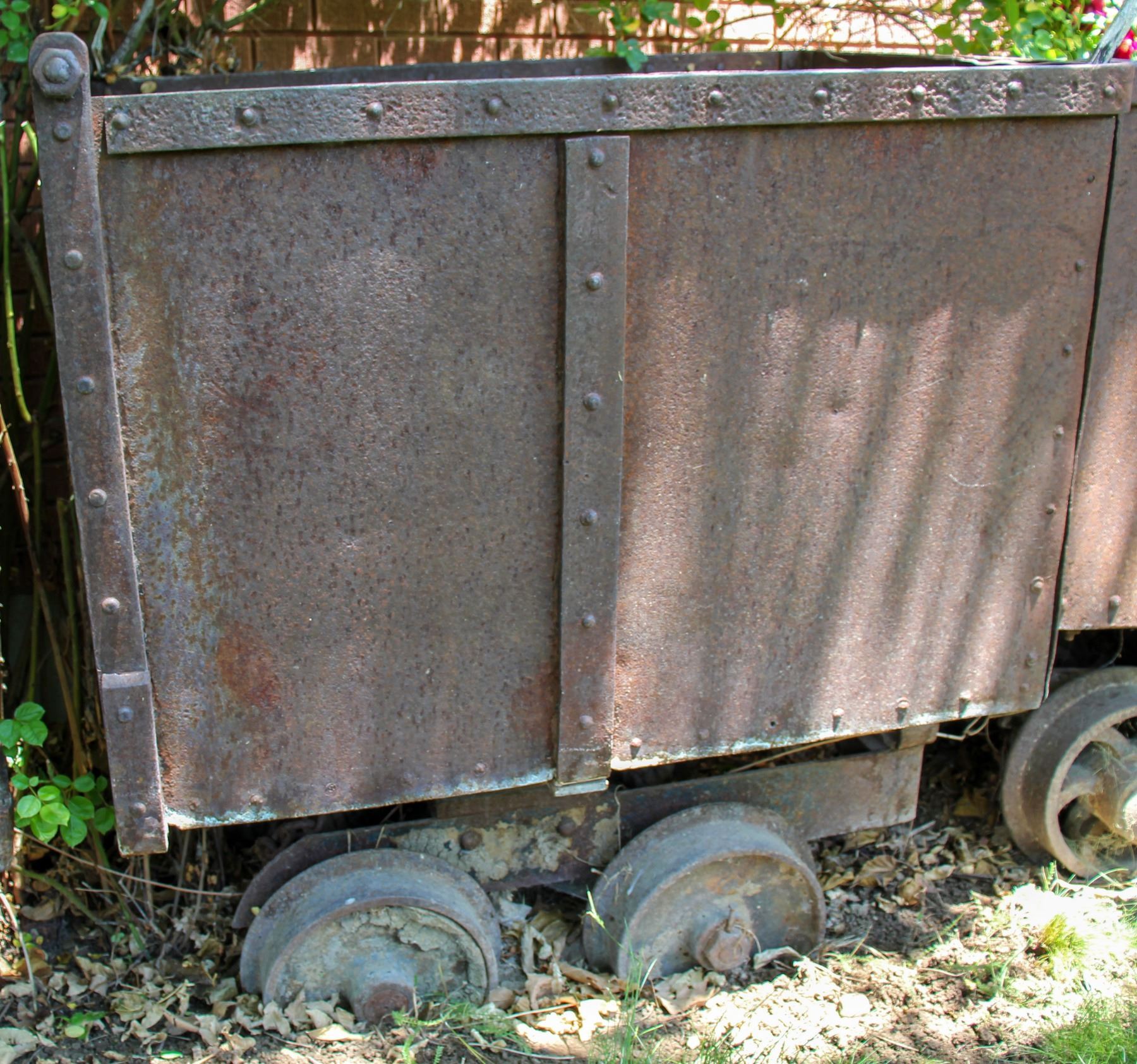 Approximate 1.2-2 ton ore car with solid wheels, end dump, single strap reinforced sides at center. FOB Salt Lake City.