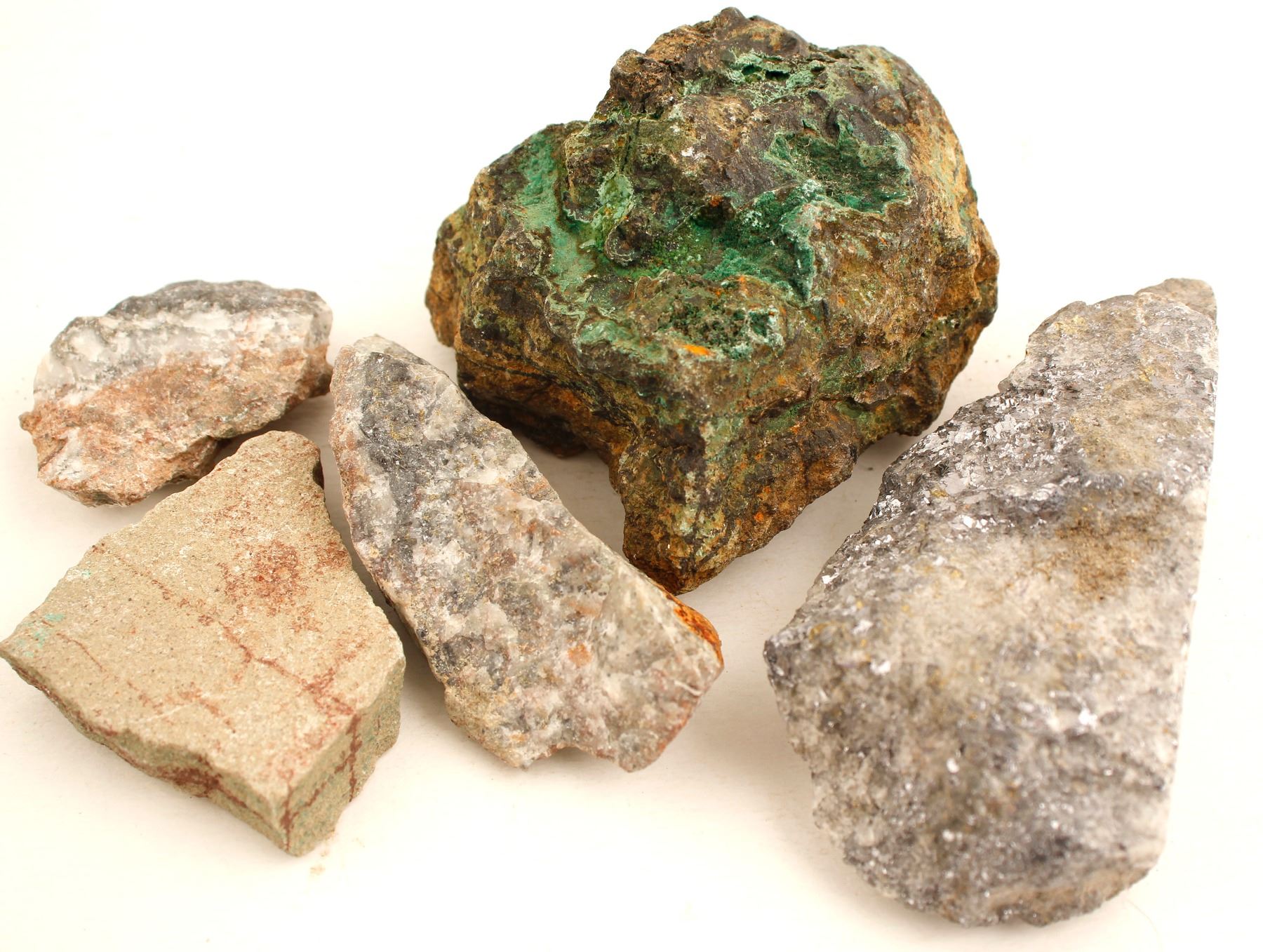 Five labeled ore specimens from the Upchurch Collection representing various locations in Chihuahua, Mexico. Total weight is about two pounds for the five pieces. Mines represented include the Las Vigas Mine, Nica, Rosario Guadalupe y Calvo (2 pieces), and La Cobriza. All are clearly labeled with black ink on a painted white background. Minerals represented include pyrite, galena, and oxide copper minerals.
