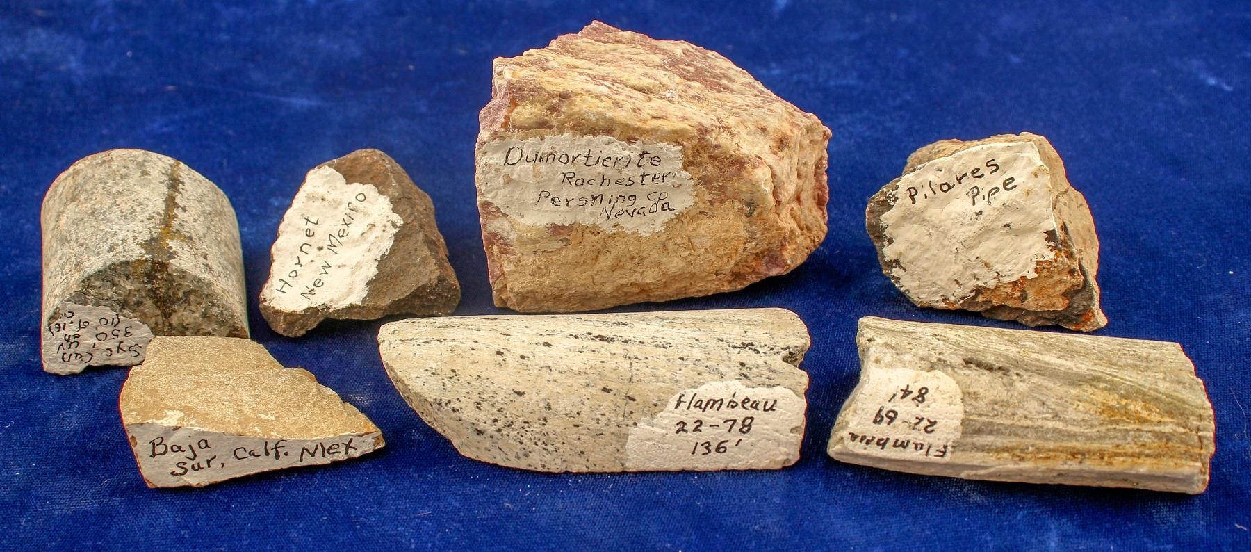 This is a selection of seven ore and mineral specimens from various locations. Included is a nice hand-size specimen of dumortierite from the Rochester Mine in Pershing County, Nevada. Labels on other pieces include Baja Sur California, Mexico; Hornet, New Mexico; Pilares Pipe; Syc Can (split core); and Flambeau (two split core). Total weight for the seven pieces is 2.6 pounds State: City: Date:
