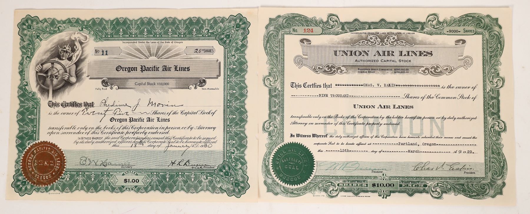 2 issued Oregon airline stocks. 1929 Union Air Lines. 1930 Oregon Pacific Air Lines. Oregon