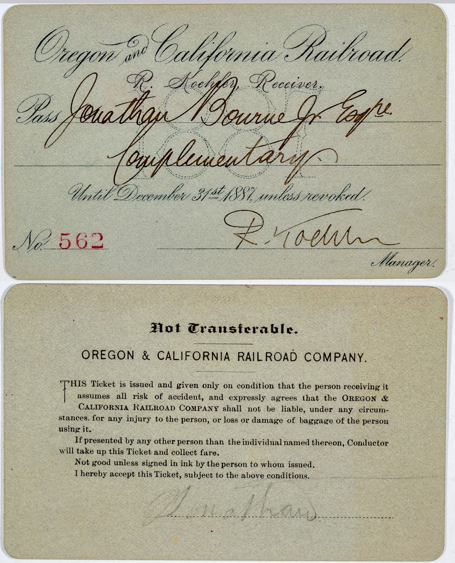 R. Koehler, Receiver. Pass No. 562, issued for 1887 to Jonathan Bourne, Jr., esq. Signed by the manager (illegible). Endorsed on the reverse. Toning. The Oregon and California Railroad was formed from the Oregon Central Railroad. The railroad qualified for land grants in California, and the name of the railroad soon changed to Oregon & California Rail Road Company. In 1887, the line was completed over Siskiyou Summit, and the Southern Pacific Railroad assumed control of the railroad. Later separated from the Southern Pacific as the Central Oregon and Pacific Railroad.