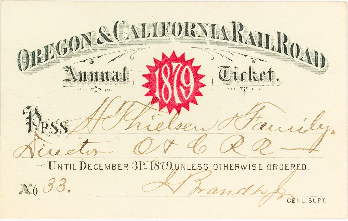 Clean, early pass issued to the director of the railroad. Pass No. 33, issued to H. Thielsen & Family. Signed by John Brandt as general superintendent. Printed on cardstock. Please see previous lot for a brief history of the company. (Prag Collection) City: State: Oregon Date: Inventory# 39334