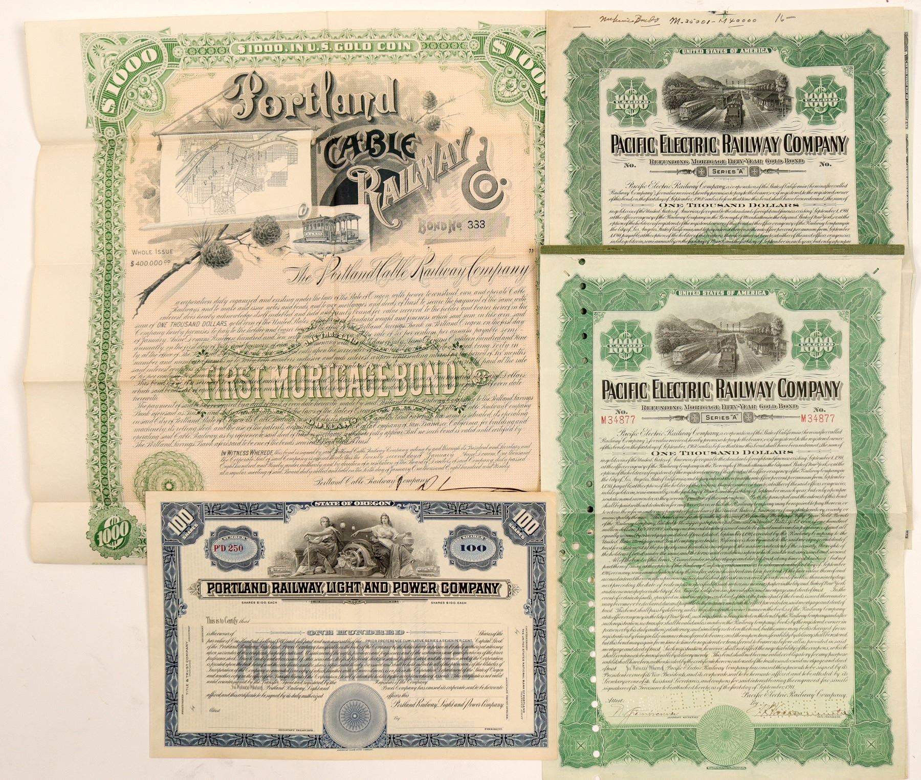 4 bonds. 1. Portland Railway, Light and Power Co. incorp 1906 Oregon through the consolidation of nearly every transportation and power generation utility between Vancouver, Washington, and Salem, Oregon. #PD250, U/U, 100 shares preferred 7%. Dated 19__. Receipt attached. American Bank Note Co. AU