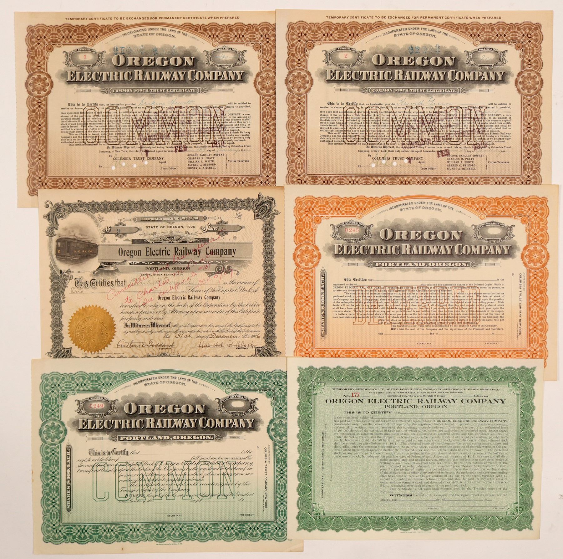 Three certificates. Incorp. 1908 Oregon. 1. Two Common Stock Trust certificates , I/C, BROWN, no vignette, no seal, "COMMON" in brown outline underprint. The Broun-Green Co. printer. #1 100 shares Issued to Erskine HewittJan 29, 1910 and #2 issued to Hewitt Green Jan 29, 1910. #C249, U/U, GREEN, common stock, 19__ and C245, ORANGE, deferred stock, 19__. Ef cond.