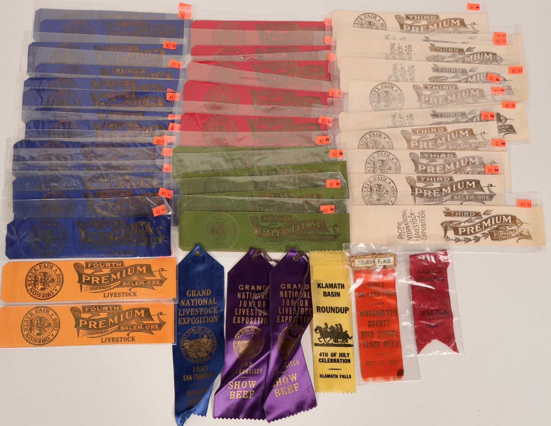 This is a lot of 36 livestock award ribbons from the Oregon State Fair. there are first place blue ribbons, second place red and on down the line. The year for these awards is not apparent although the year of the fair's inception, 1859, is noted, although the first official fair took place a year earlier. See photos for more details.