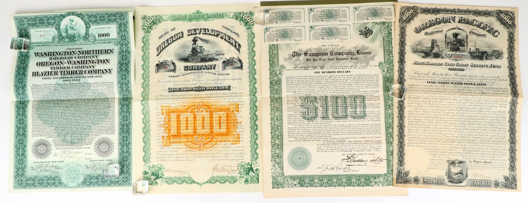 Lot of four: Oregon Pacific Railroad, 1880; shipping wharf vignette. Oregon Development Company, 1894, signed Geo. M. Davis, President, railroad vignette. Washington-Northern Railroad Company Oregon- Washington Timber Company Blazier Timber Company, 1912. The Sampson Company Limited, 1916.