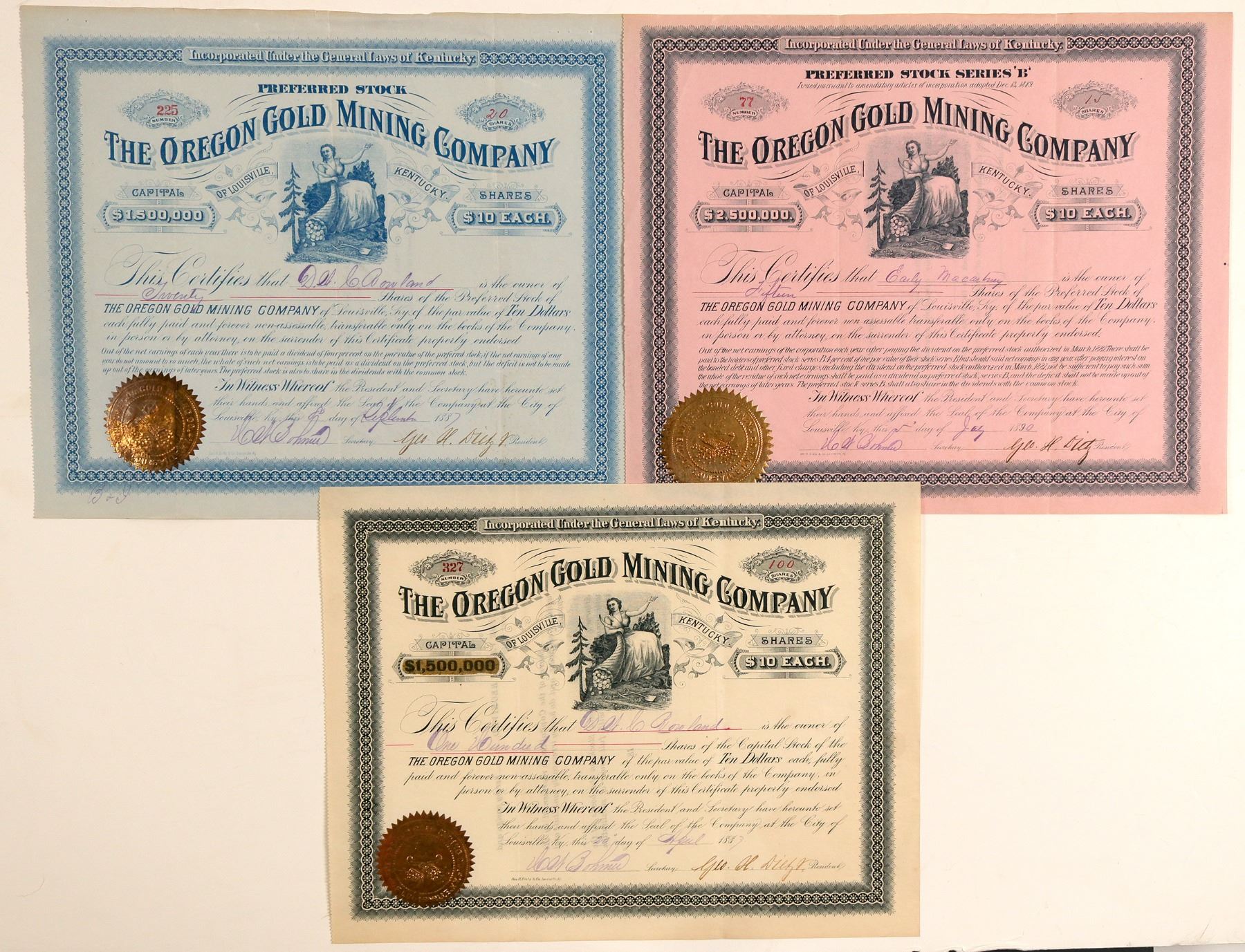 Lot of three. All the same, but all on different color paper: red, white and blue. Numbers 77 (preferred stock 'B'), 225 (preferred stock), and 327 (common stock). All are signed by HW Bohm and George H Dietz president. All have a nice gold seal with horn-a-plenty full of gold. All have the same horn-a-plenty vignette. Printer is Dietz of Louisville - YES the president of the company! In very nice condition - blue stock has upper border fold issue. The Report on Mines and Mining of the Oregon Senate in 1893 reported, "The Oregon Gold Mining Company of Louisville, Ky. bought one of the most extensive properties, the Whitman, and upon it and others which the company purchased and located, they expended $200,000 in improvements during the first two years, including a $40,000 stamp mil,l which has lately been improved by the addition of a chlorinating plant. This company has done more in furthering the work of improvement in Cornucopia than any other. They have extensive tunnels and inclines and when spring opens will put on a large force of men. There about twenty mines in Cornucopia today." Ken Prag Collection