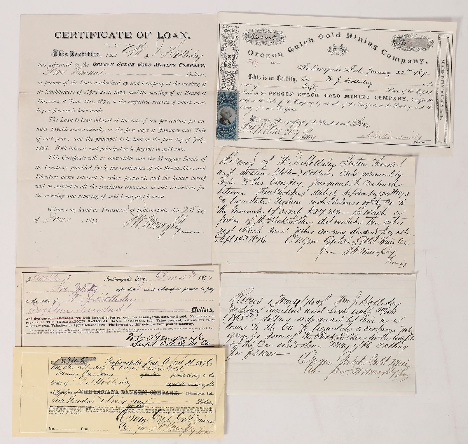 Includes 5 documents related to financial transactions between W.J. Holliday and the company, including an 1873 $5,000 certificate of loan and 4 other loans made to the company by Holliday.
