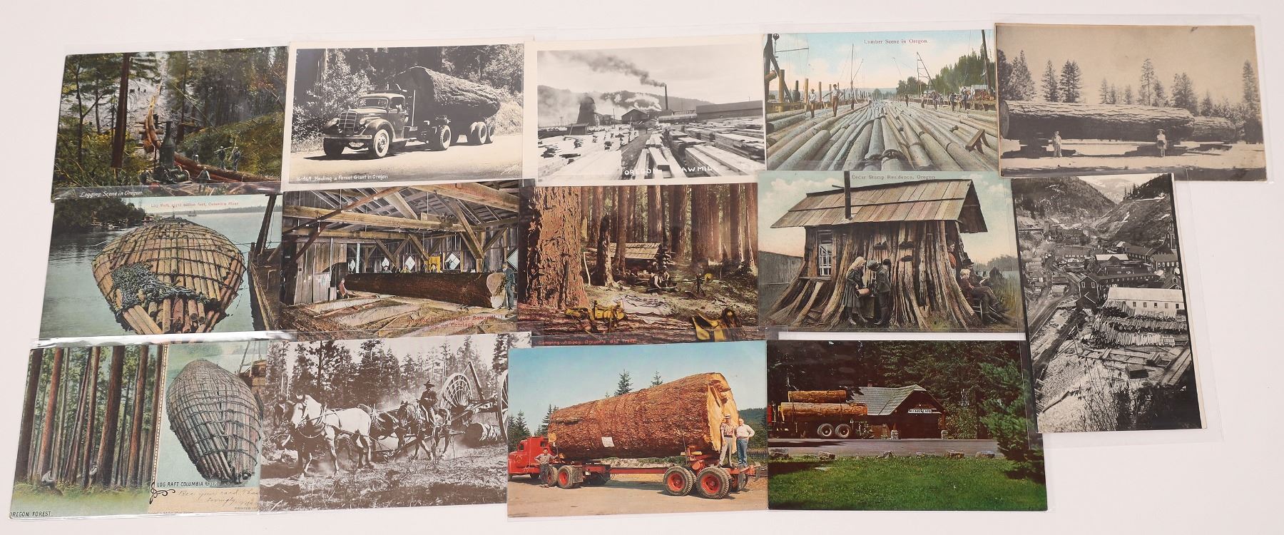 Lot of 14 including 3 real photo, 1 undivided back, 6 divided back, and 4 modern cards. Includes: log raft on Columbia River (1907); cedar stump residence; camping around Big Tree; interior of sawmill; hauling a forest giant; lumber yard at Burns; and other logging views.
