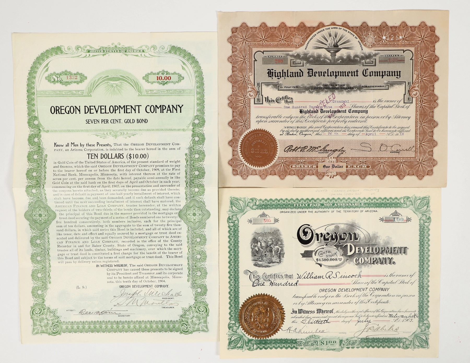 Lot of 3. Oregon Development Co. 7% gold bearer bond. I/U, 1904 Baker Ore. gold town w/famous Virtue mine. Highland Development Co. I/C, 1912 unk. printer. Oregon Development Co. stock I/U, 1903 Unk. printer.