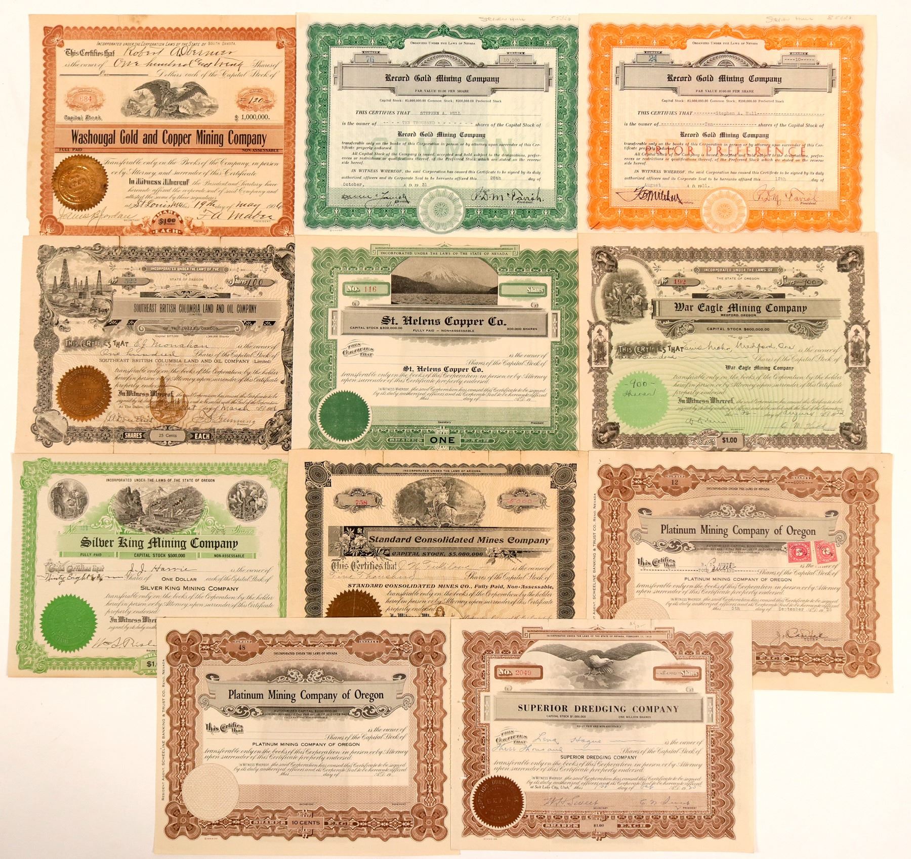 Nice group of Oregon mining stocks. Lot includes: Washougal Gold & Copper MC, issued 1906, St. Helens district; Record Gold MC, (2) 1931, Baker, Ore.; Superior Dredging Company, 1925, Burnt River district; Platinum Mining Company of Oregon (2), one issued in 1928, the other UI, Standard Cons. Mines Company, 1903, Silver King Mining Company, 1914, War Eagle Mining Company, 1923, Medford, Oregon on the masthead; Southeast British Columbia Land and Oil Company of the Dalles, Oregon, 1906, St. Helens Copper Co. (Mt. St. Helens vignette), UI. Most are uncancelled and some have condition issues. Please inspect lot.