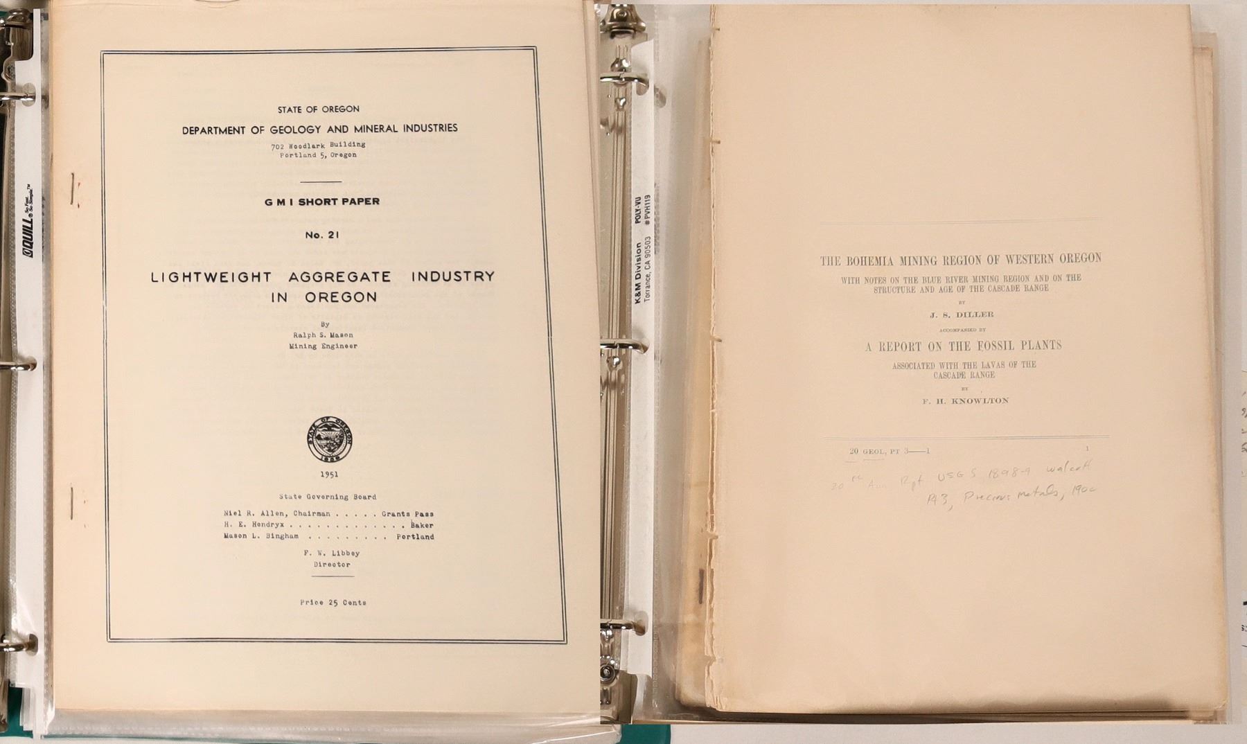 1) THE BOHEMIA MINING REGION OF WESTERN OREGON by J.S. Diller accompanied by A REPORT ON THE FOSSIL PLANTS. 2) Various mining papers including: Lightweight Aggregate Industry in Oregon by Ralph S. Mason, Mining Engineer, Oil and Gas Exploration in Oregon by R. E. Stewart.