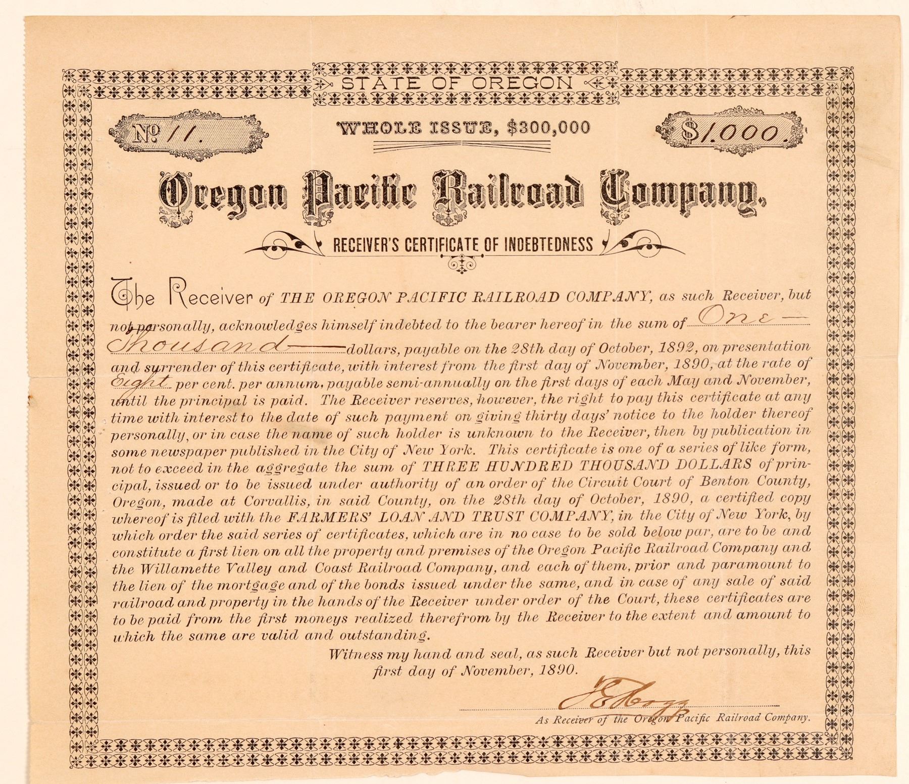 Incorp. 1880 Oregon. #11,I/U, receivers certificate for $1000, 8% due 1892. Issued Nov. 1, 1890. Signed T.E. Hogg receiver. BLACK, no seal. No vignette. Unknown printer. EF. Ken Prag Collection