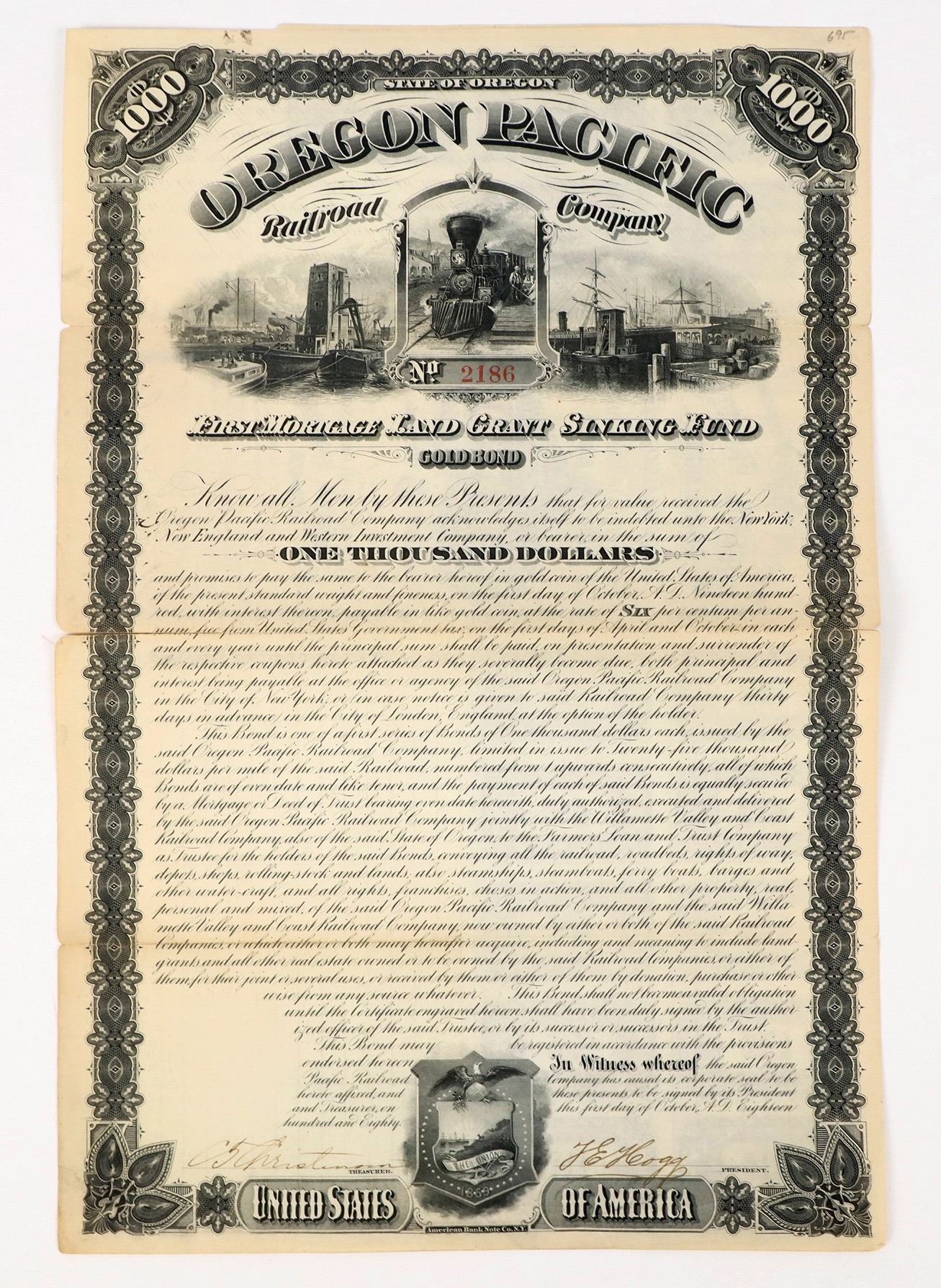 I/U. Issued 1880. VG cond. , There are separations at the fold lines. . Oregon Pacific Railroad Co., $1000, 6% gold bearer bond, with coupons. Great vignette : two dockside and one of train between them. Extra rare. American BNC printer.