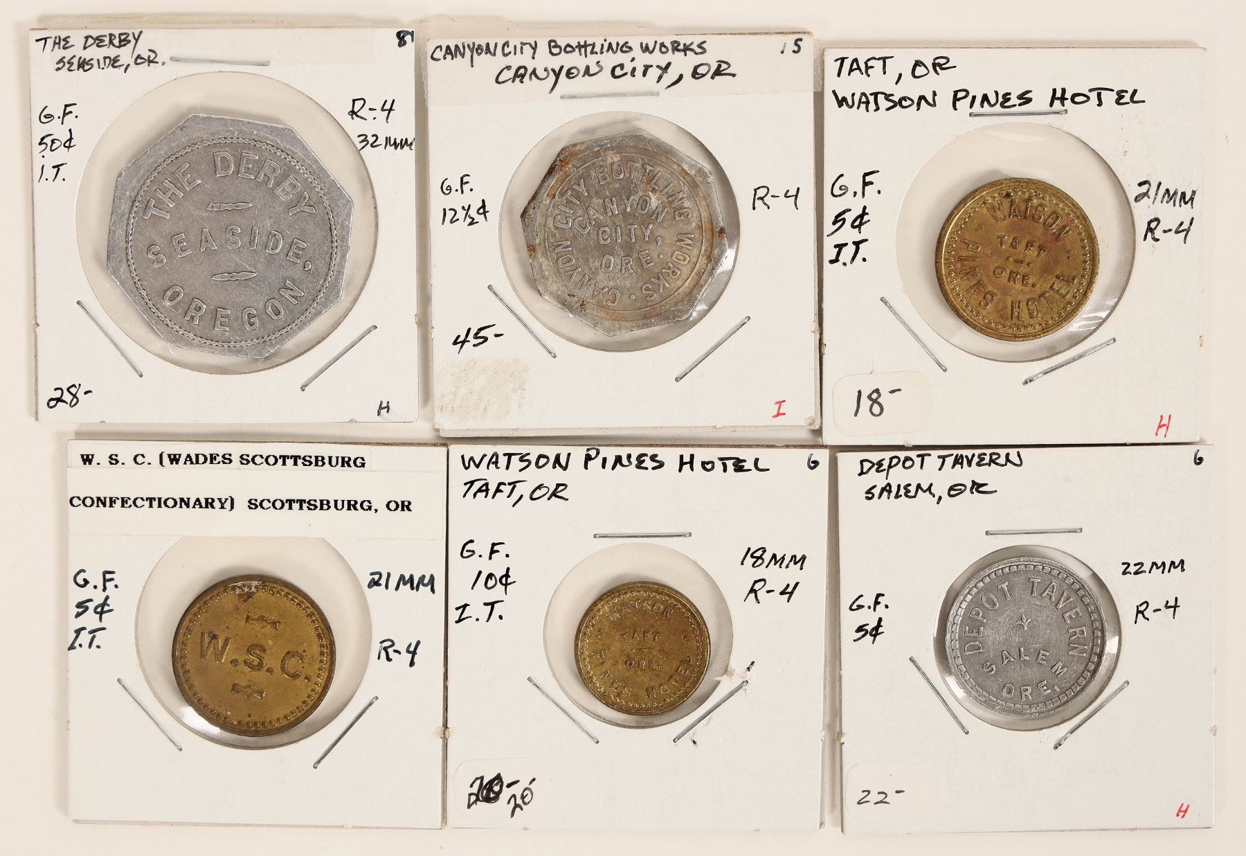 Six R-4 (11-20, very scarce) Oregon tokens: Salem: Depot Tavern; Taft: Watson Pines Hotel (2 different); Canyon City: Canyon City Bottling Works; Seaside: The Derby; Scottsburg: Wades Scottsburg Confentionary. [ Oregon