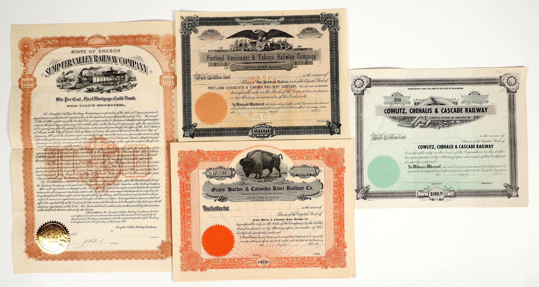 Lot of 4 different. All unissued. Includes: Sumpter Valley Railway Co. $1,000 bond (1907); Portland Vancouver & Yakima Railway; Grays Harbor & Columbia River Railway Co.; and Cowlitz, Chehalis & Cascade Railway (large crease).