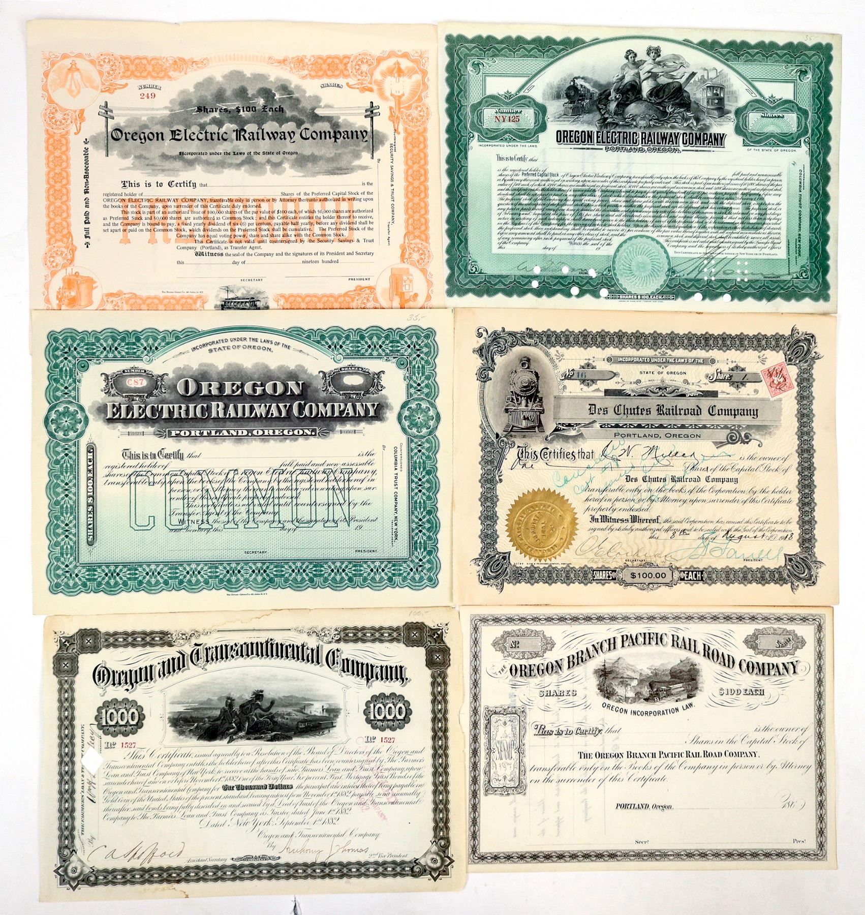 Lot of 6 different. Includes: Oregon & Transcontinental Co. ($1,000 bond, 1882, water damage); Oregon Branch Pacific Railroad Co. (unissued 1860s); Des Chutes Railroad Co. (1918, Portland); and Oregon Electric Railway Company (three different unissued certificates).