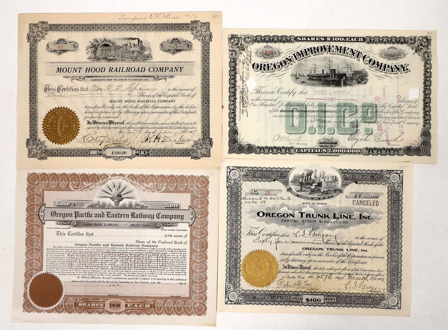 Issued-1907 Mount Hood Railroad-.5" lower crease tear, 1890 Oregon Improvement, 1908 Oregon Trunk Line. Unissued-Oregon Pacific and Eastern Railway.