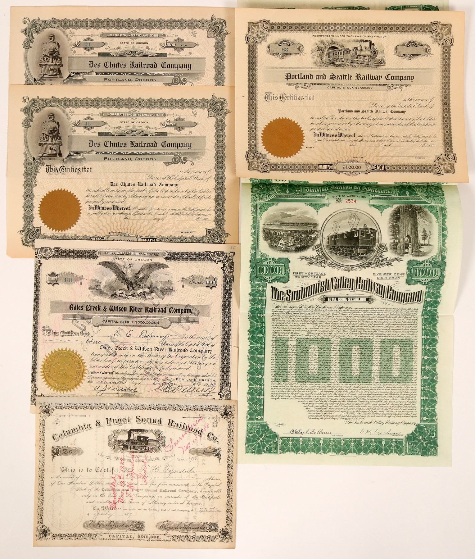 Five railroad stock certs, two (one with transfer stamp affixed) issued by Des Chutes RR, Gales Creek & Wilson River RR, Columbia & Puget Sound RR and Portland & Seattle RY Company. There is also a $1,000 bond first mortgage document issued by The Snohomish Valley RY Co. All are in good condition. See photos for more detail.