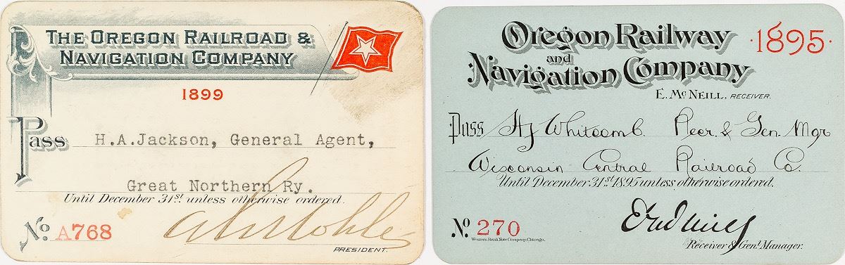 Two different for this company operating a large railroad operation in Oregon, Idaho and Washington and steamer line on the Columbia River. 1) 1895, issued to HF Whitcomb, general manager of Wisconsin Central RR. Blue/green cardstock. Very good condition. 2) 1899, issued to H.A. Jackson, general agent for Great Northern Railway. Signed by the president. Printed on cardstock. Some soiling and toning. (Prag Collection) City: State: Oregon Date: Inventory# 39151