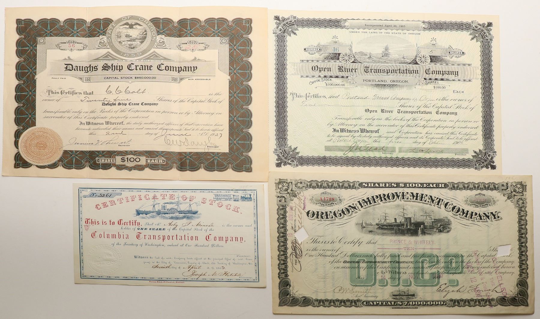 4 Oregon river transportation stocks. 1863 Columbia Transportation. 1906 Open River Transportation. 1890 Oregon Improvement. 1927 Daughs Ship Crane. Oregon