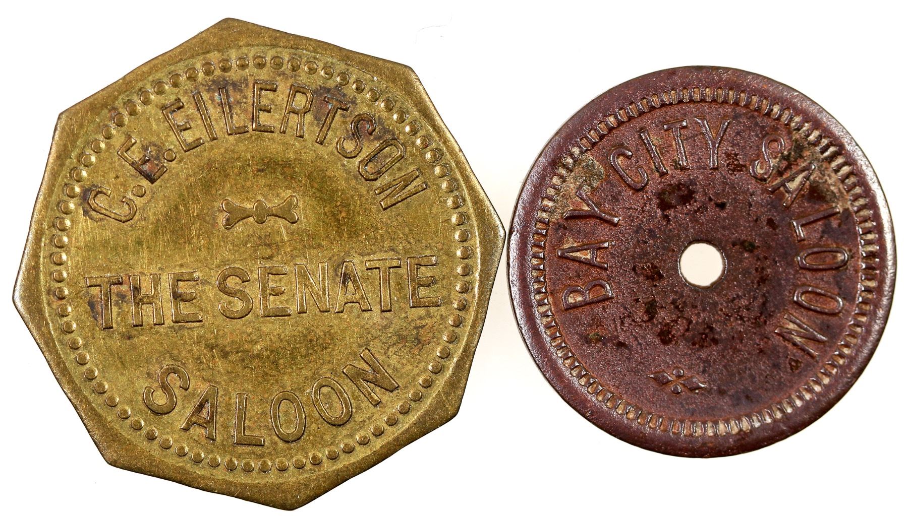 Two unlisted maverick saloon tokens: 1) unlisted: Bay City Saloon // Good For / 5c / In Trade; Br. rd., 21 mm, center hole. Tillamook county? 2) C. E. Eilertson / The Senate / Saloon // Good for / 5c / In Trade; Br., octagonal, 25 mm. (token ID'd on page 25 of the supplement to Hemphill).[ Oregon