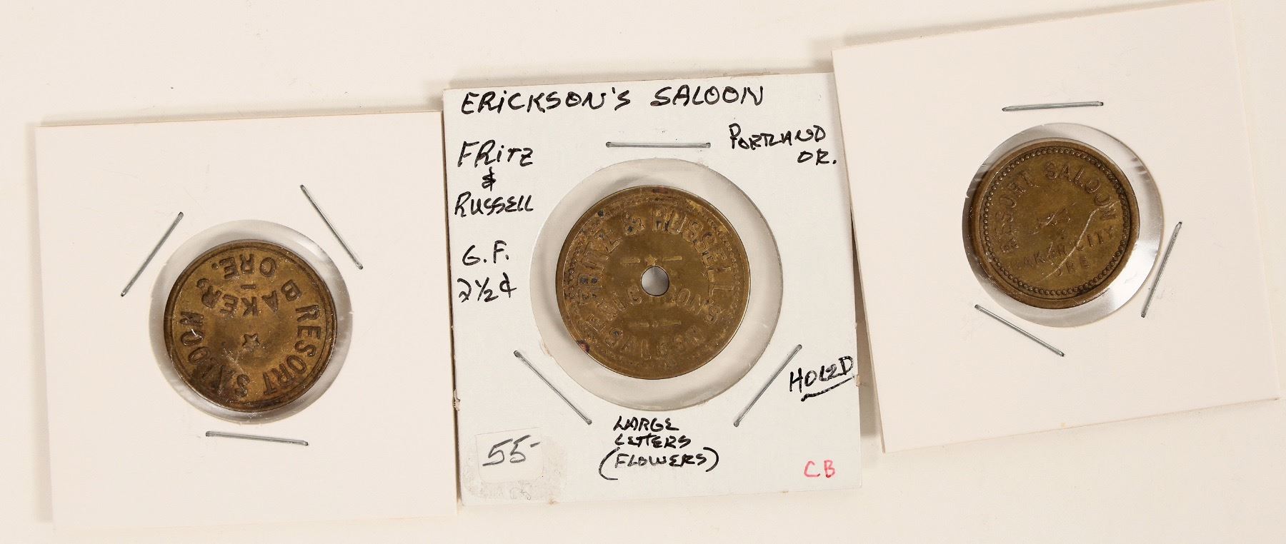 Three different Oregon saloon tokens: Portland: Erickson's (center hole);2) Baker City: Resort Saloon, GF 5c;; Baker: Resort Saloon, GF 5c. [ Oregon