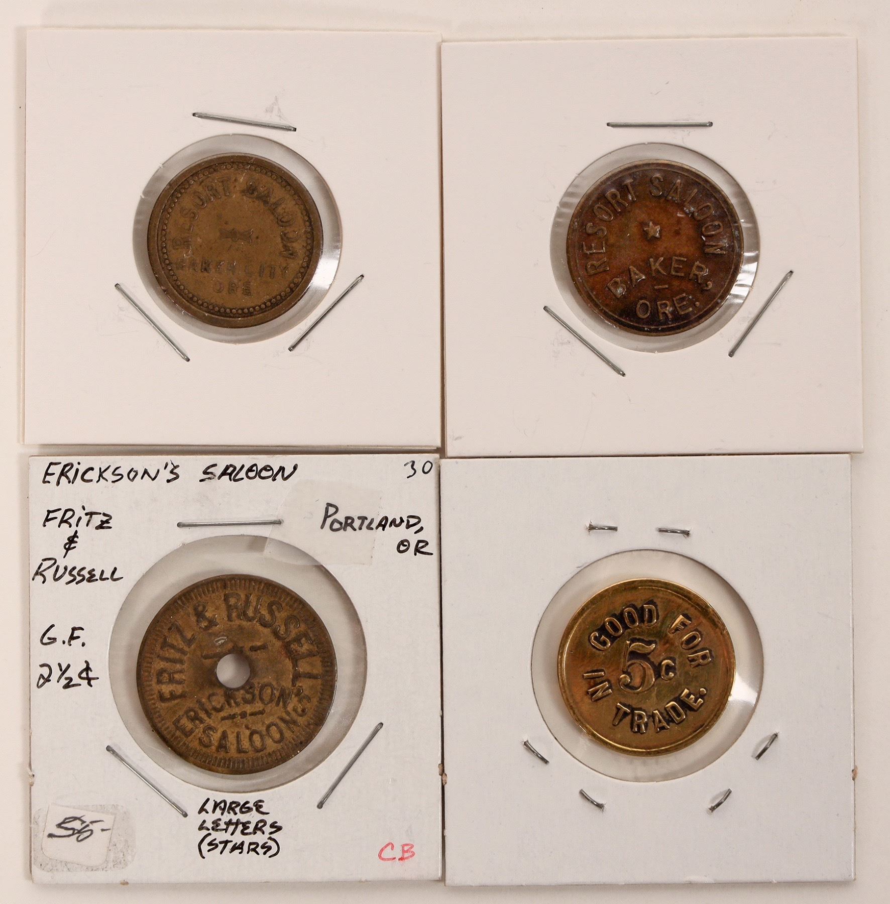 Four saloon tokens from Oregon: Resort Saloon, Baker; Erickson's Saloon, Portland; Mt. Hood Saloon; Resort Saloon, Baker City. [ Oregon