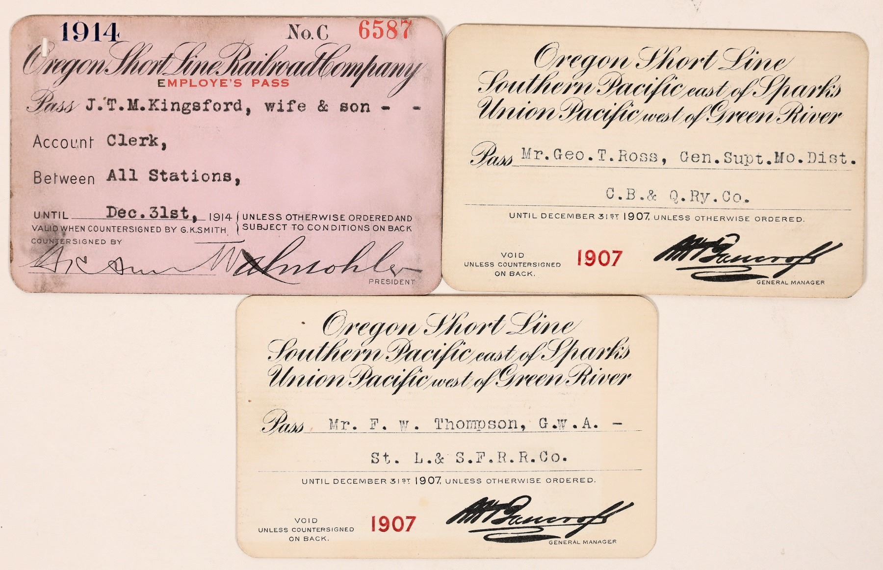 Three railroad passes for the Oregon Short Line Southern Pacific east of Sparks Union Pacific west of Green River: two are 1907, one 1914.