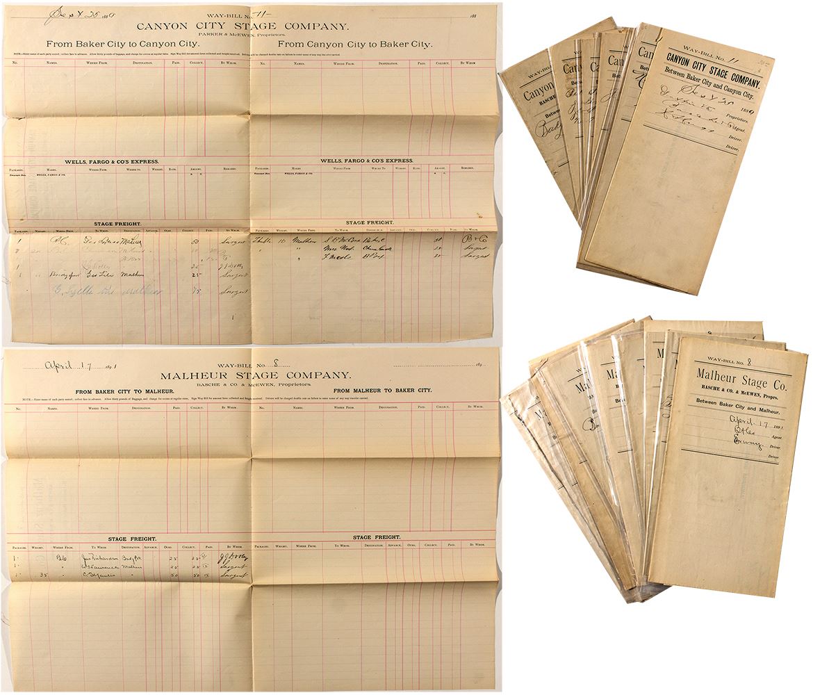 17 way bills. Two different stage companies: ten from Malheur Stage Co. (all 1891) and seven from Canyon City Stage Co. (1887-1890). For service between Baker City and Malheur. All used. Measure 14" x 20." Overall condition is good with some toning and rips/separation occurring along folds on some of the way bills.