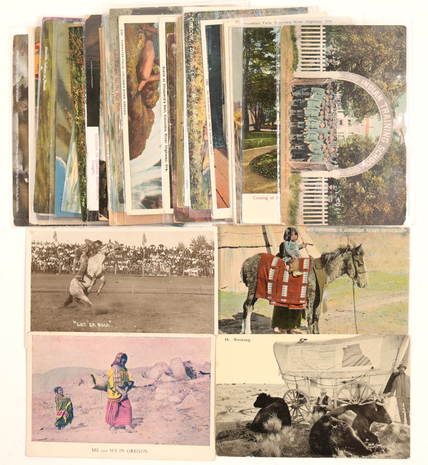 34 different cards mainly in color from 1900 - modern times. Tribes include Umatilla, Clatsop, Cayuse. Also photographs of Horsetail Falls, Pendleton Round-up - 1911, Tumwater Falls, fishing on Snake River. Indians in Oregon have traditionally grown tobacco, wapato, and corn.