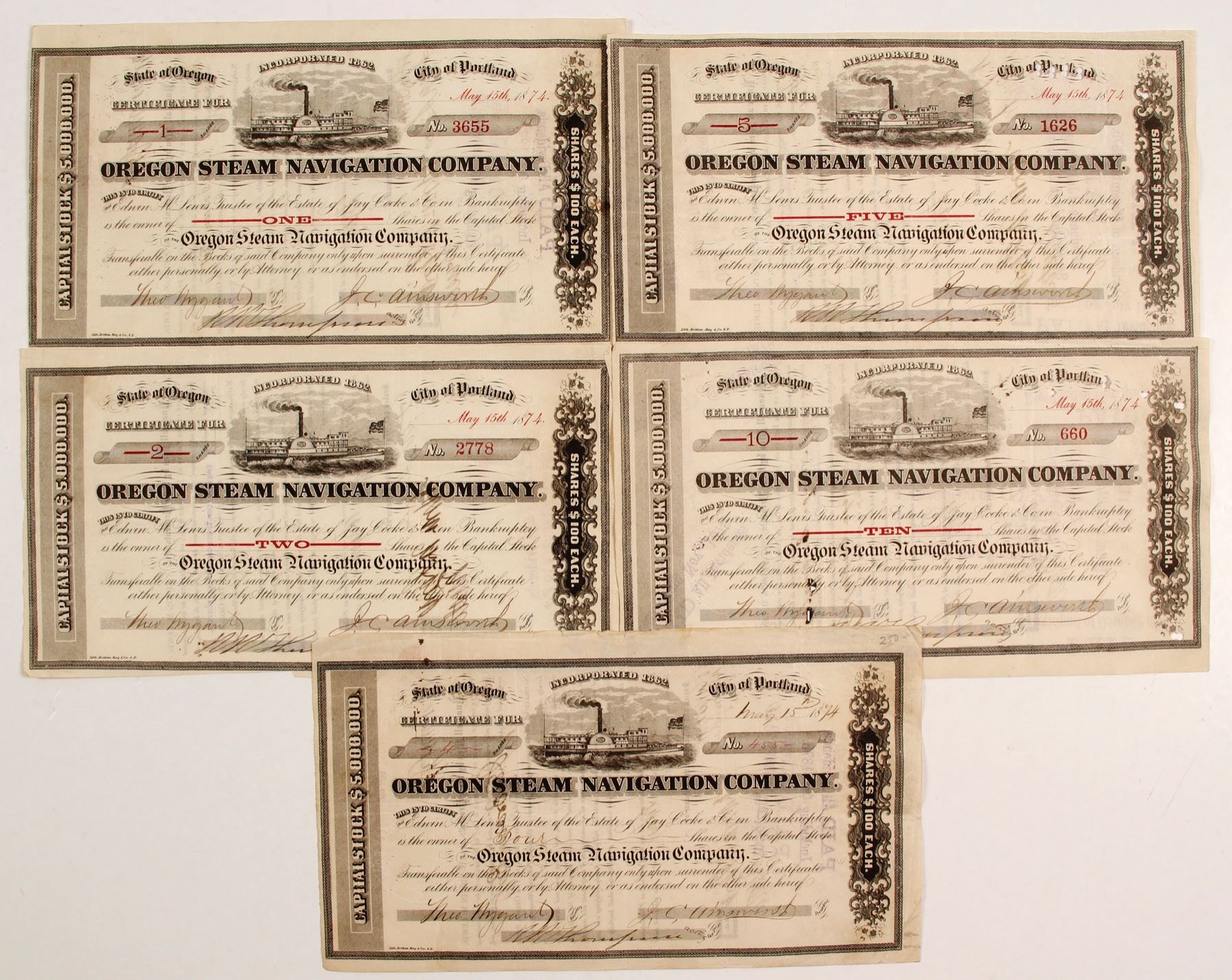 Certainly interesting and possibly unique collection of preprinted shares to Edwin M Lewis Trustee of the Estate of Jay Cooke and Co. # 3655 1 share, #2778 2 shares, #455 4 shares, #1626 5 shares, #660 10 shares-ink breakthru. Signed by President JC Ainsworth. Steamer vignette. "The Oregon Steam Navigation Company (O.S.N.) was an American company incorporated in 1860 in Washington with partners J. S. Ruckle, Henry Olmstead, and J. O. Van Bergen. It was incorporated in Washington because of a lack of corporate laws in Oregon, though it paid Oregon taxes. The company operated steamships between San Francisco and ports along the Columbia River at Astoria, Portland and The Dalles, serving the lumber and salmon fishing industries.[2] A railroad was built to serve the steamship industry." from wikipedia. Prag Collection State: Oregon City: Date: 1874 HWAC# 83369
