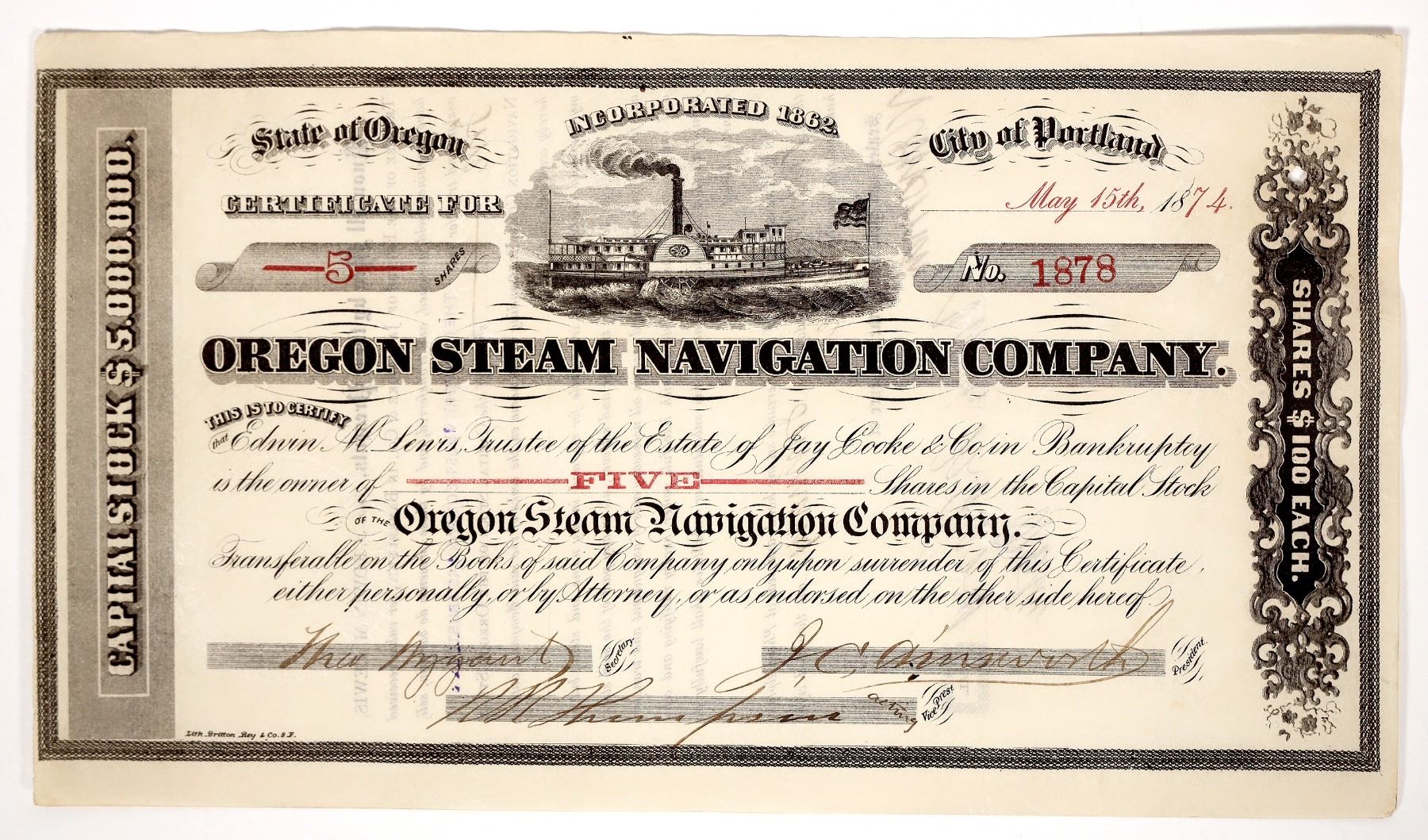 Issued 1874. "The Oregon Steam Navigation Company (O.S.N.) was an American company incorporated in 1860 in Washington with partners J. S. Ruckle, Henry Olmstead, and J. O. Van Bergen. It was incorporated in Washington because of a lack of corporate laws in Oregon, though it paid Oregon taxes. The company operated steamships between San Francisco and ports along the Columbia River at Astoria, Portland and The Dalles, serving the lumber and salmon fishing industries. A railroad was built to serve the steamship industry." from Wikipedia. Nice condition.