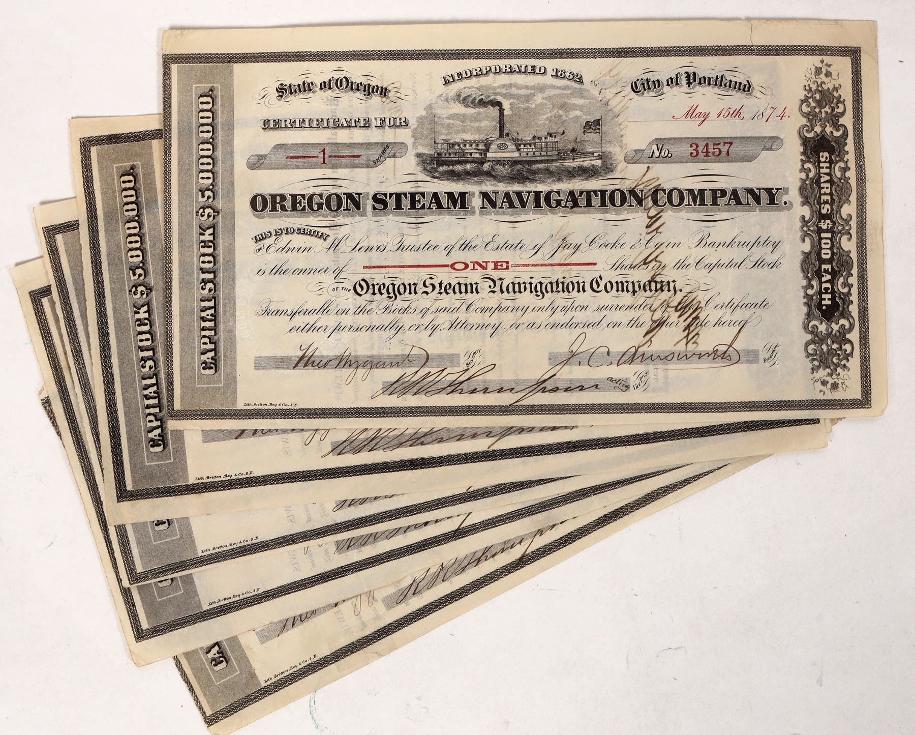 Very rare set. 5x 1874 Oregon Steam Navigation Steam Ship stock bearer scrip notes. Marked in red for number of shares-1, 2, 5 ,10 and handwritten 50. "The Oregon Steam Navigation Company (O.S.N.) was an American company incorporated in 1860 in Washington with partners J. S. Ruckle, Henry Olmstead, and J. O. Van Bergen. It was incorporated in Washington because of a lack of corporate laws in Oregon, though it paid Oregon taxes. The company operated steamships between San Francisco and ports along the Columbia River at Astoria, Portland and The Dalles, serving the lumber and salmon fishing industries. A railroad was built to serve the steamship industry." from Wikipedia.