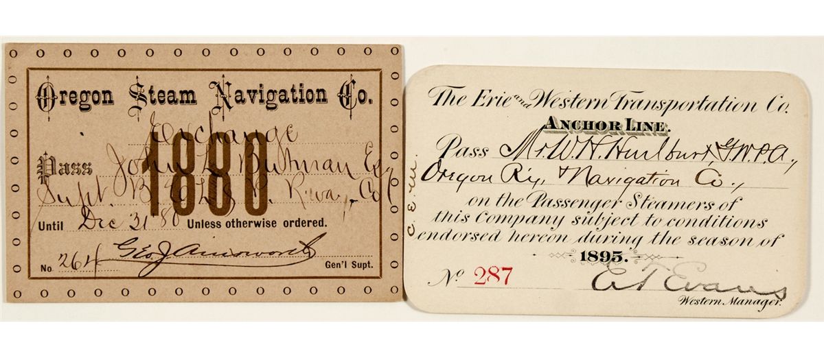 Two passes: Oregon Steam Navigation Co. (1880) and an1895 Erie & Western Transportation Co. pass issued to an employee of Oregon Railway and Navigation Co. Prag Collection