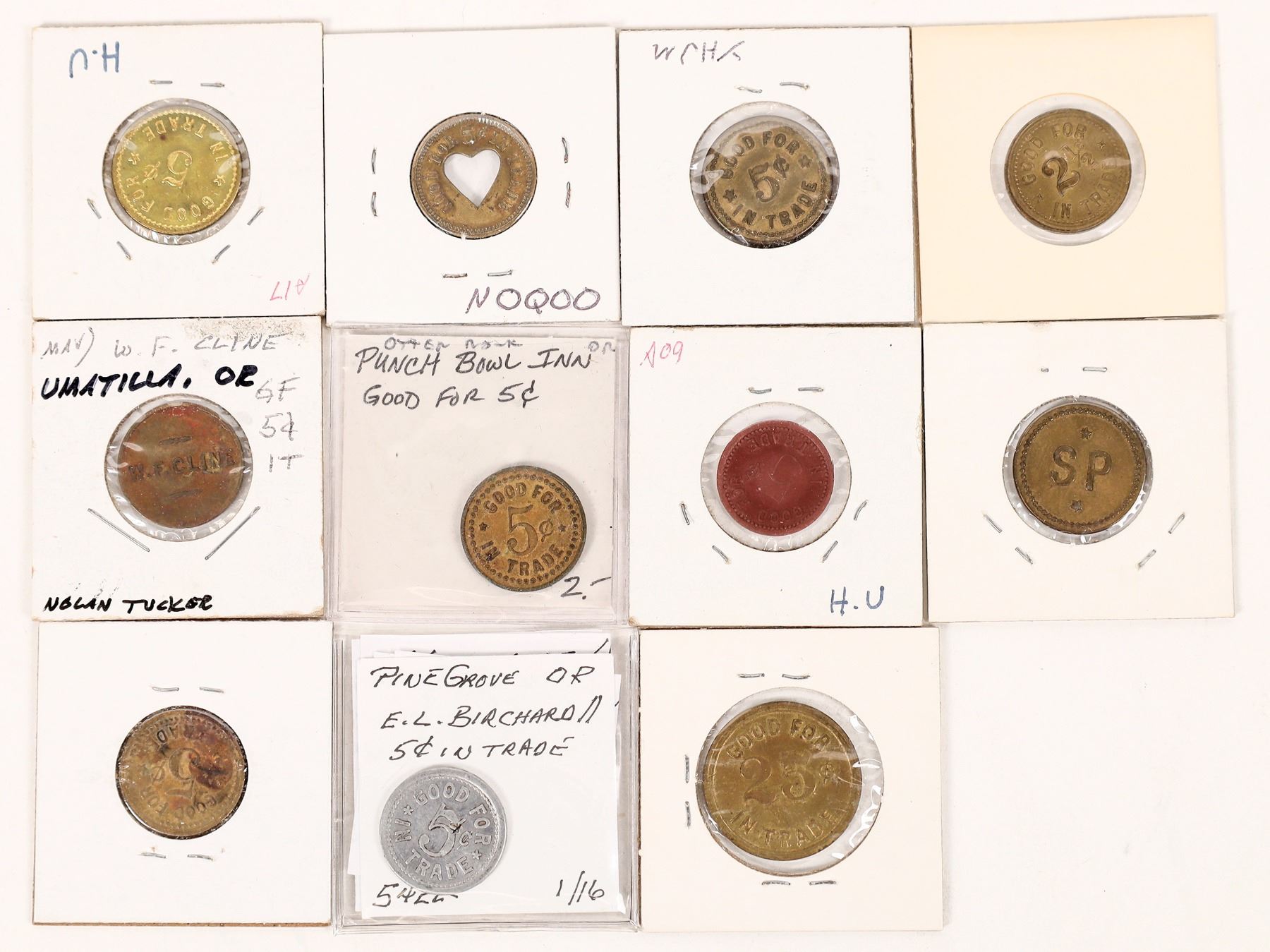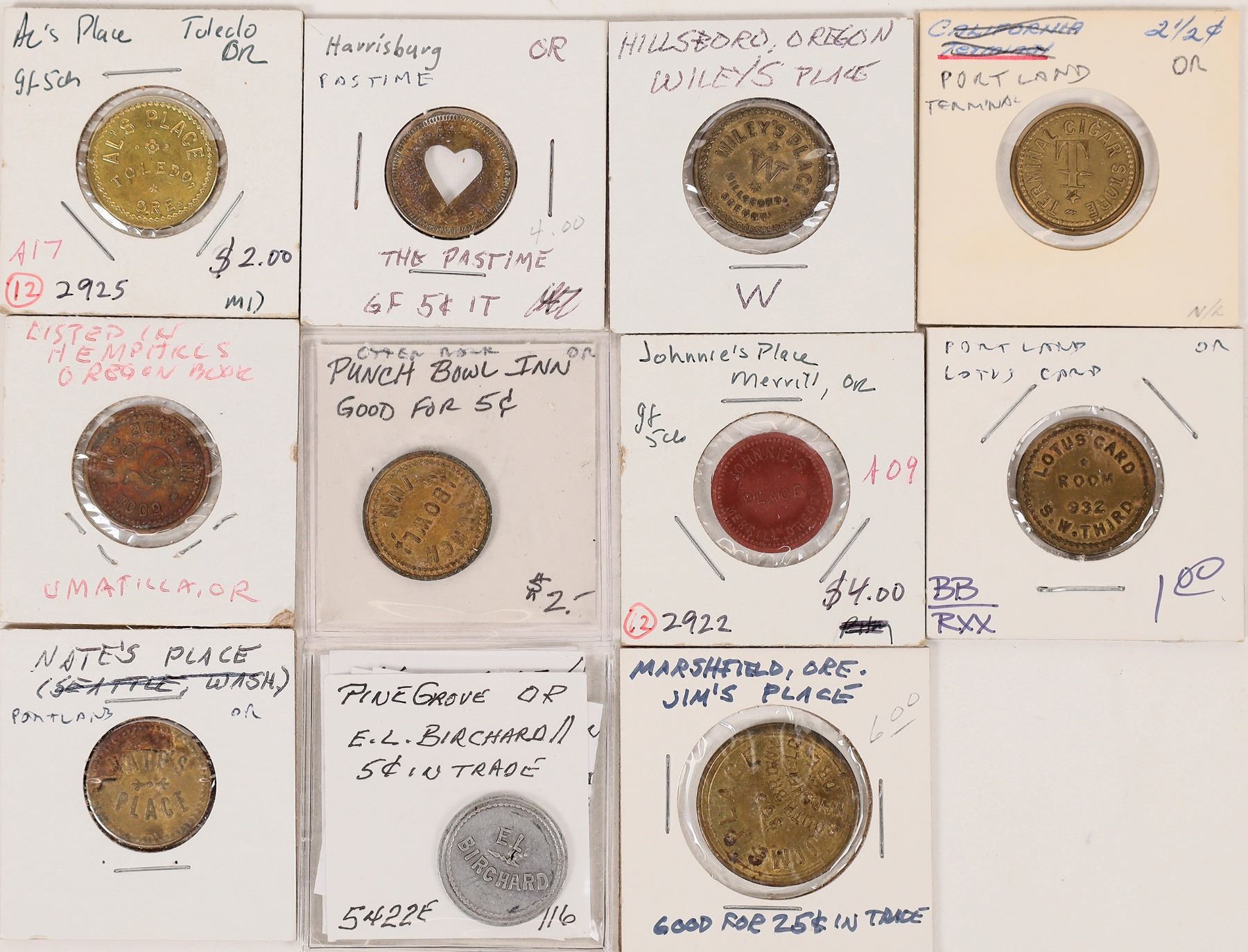 Lot of eleven tokens from Oregon: Toledo; Merrill; Harrisburg; Marshfield; Hillsboro; Umatilla; Pine Grove; Portland (3). Oregon
