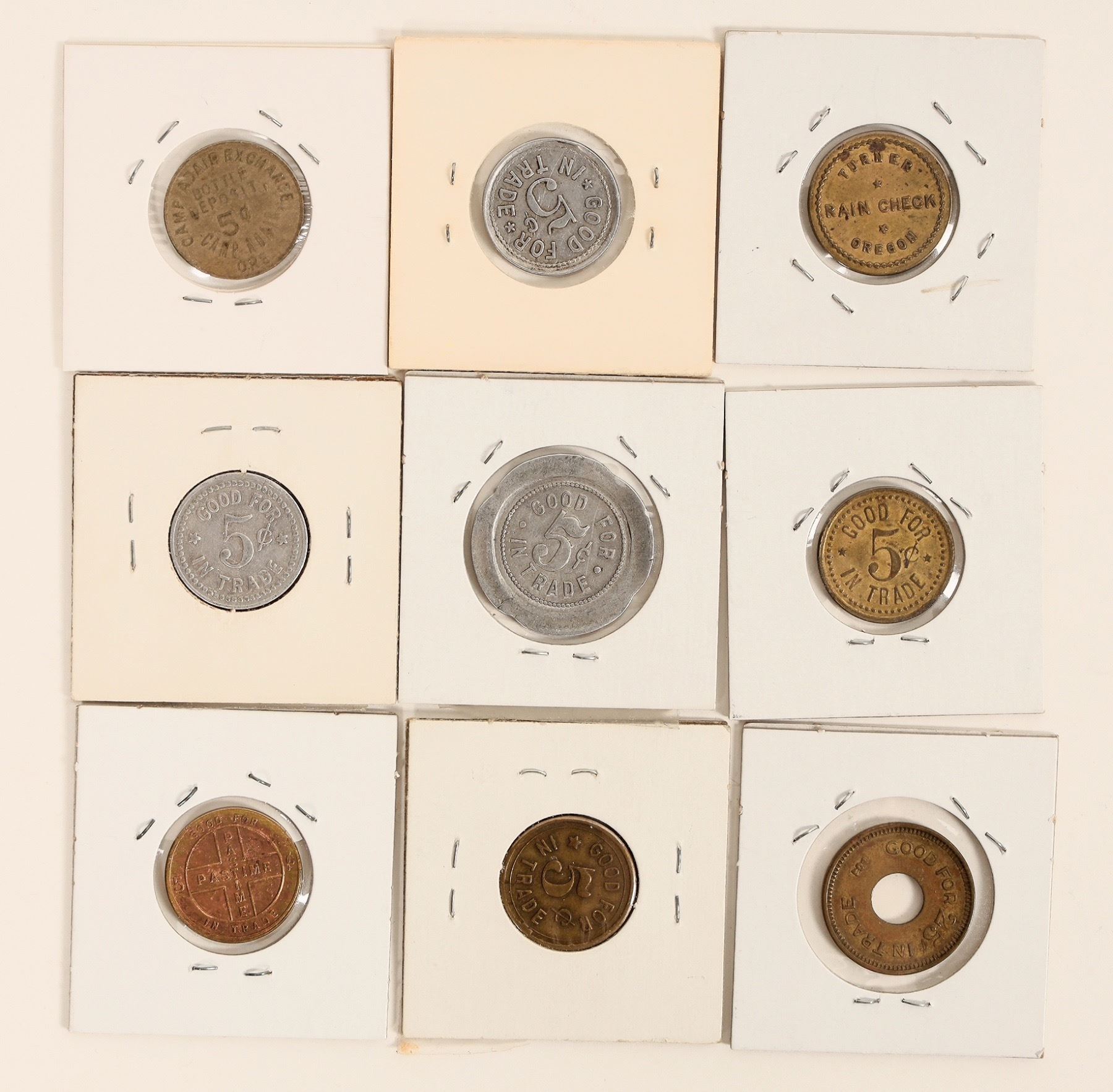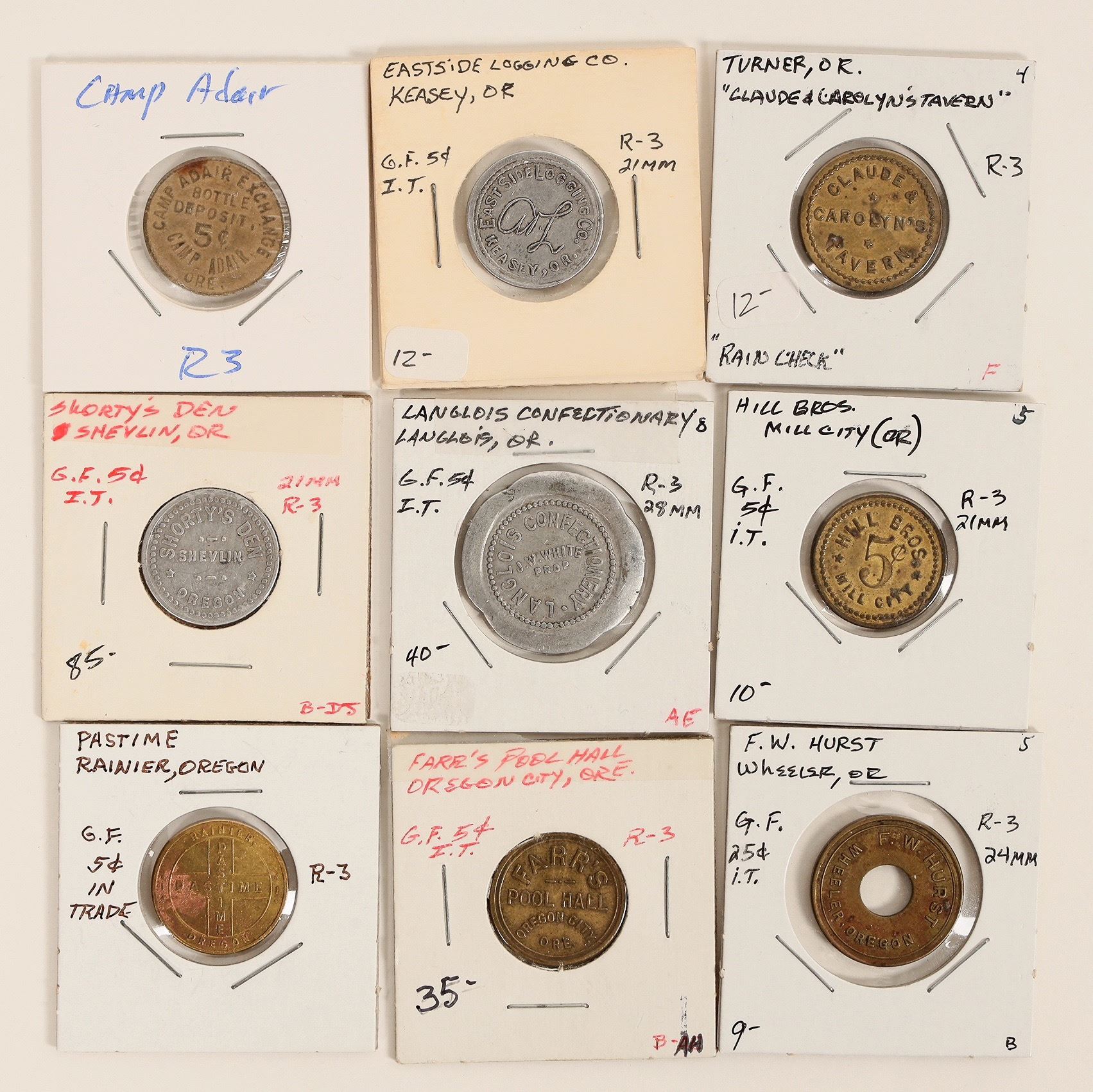 Lot of nine R 3 (21-35 known, scarce) Oregon tokens: Wheeler: F. W. Hurst; Mill City: Hill Bros.; Langlois: Langlois Confectionary; Shevlin: Shorty's Den; Oregon City: Farr's Pool Hall; Turner: Claude & Carolyn's Tavern; Keasey: Eastside Logging Co.; Rainier: Pastime; Camp Adair Exchange.[ Oregon