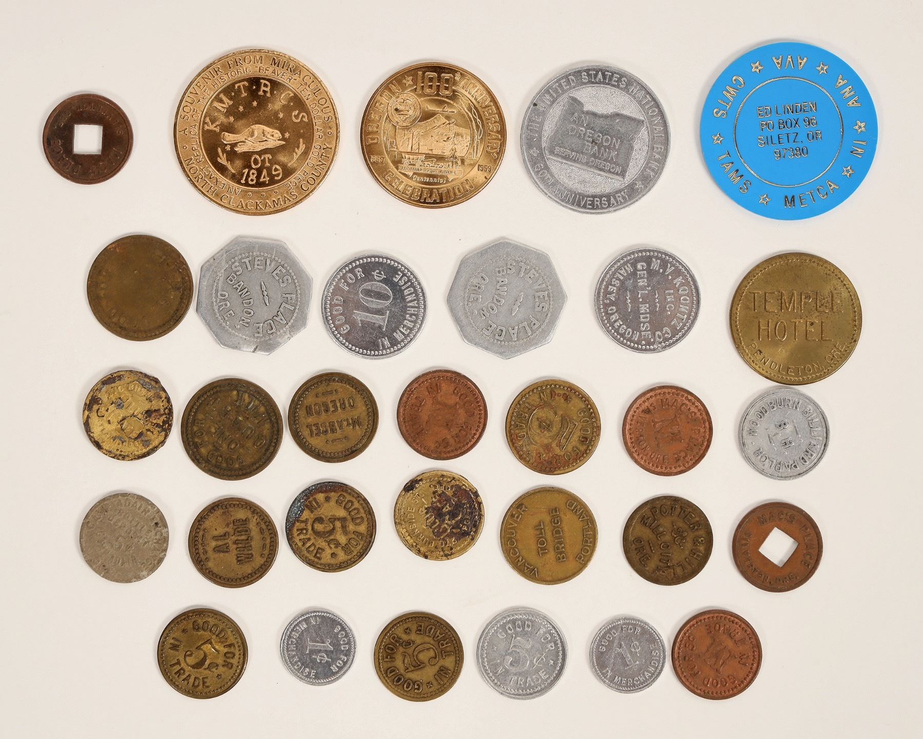 Miscellaneous group of 31 tokens and medals from Oregon: 1959 Oregon Centennial; 1951 Oregon Historical Caravan; Temple Hotel, Pendleton, and many more. [ Oregon