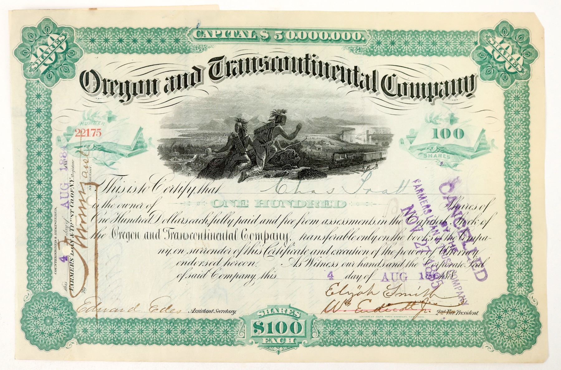 A stock certificate for one hundred shares in the Oregon and Transcontinental Company, dating from 1884. Oregon and Transcontinental was a holding company founded in 1881 to control holdings in the Northern Pacific Railroad and Oregon Railway and Navigation Company.. Interesting vignette of two Native American braves watching a train pass below. Cancelled using a stamp cancellation.