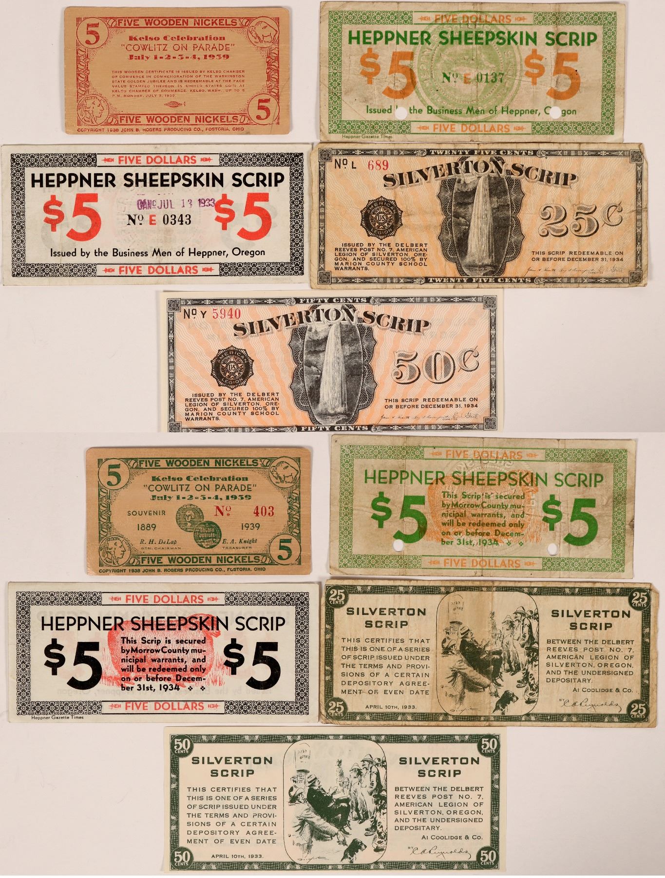 2. Two Heppner Sheepskin Scrip, $5, #E0343 (VF) and E0137(F), Issued Heppner, Ore. 1933, backed by Morrow County Municipal warrants.
