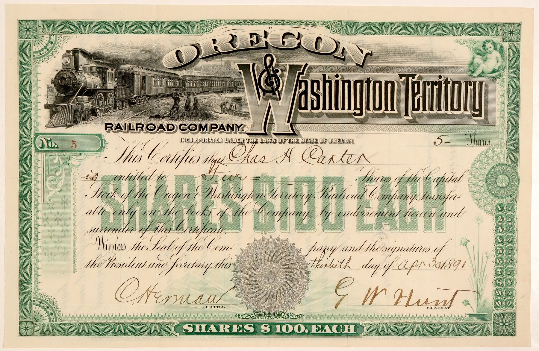 #5 for 5 shares @ $100 par issued to Chas. H. Carter April 30, 1891. Signed G.W. Hunt President. GREEN, embossed seal, vignette 4-4-0 passing men waving. "SHARES $100EACH" green underprint. American Bank Note Co. printer. EF cond Ken Prag Collection